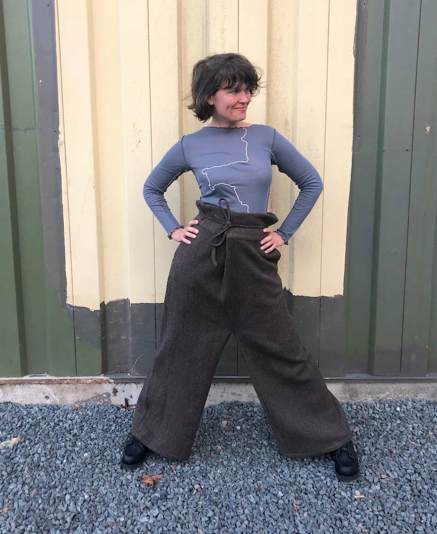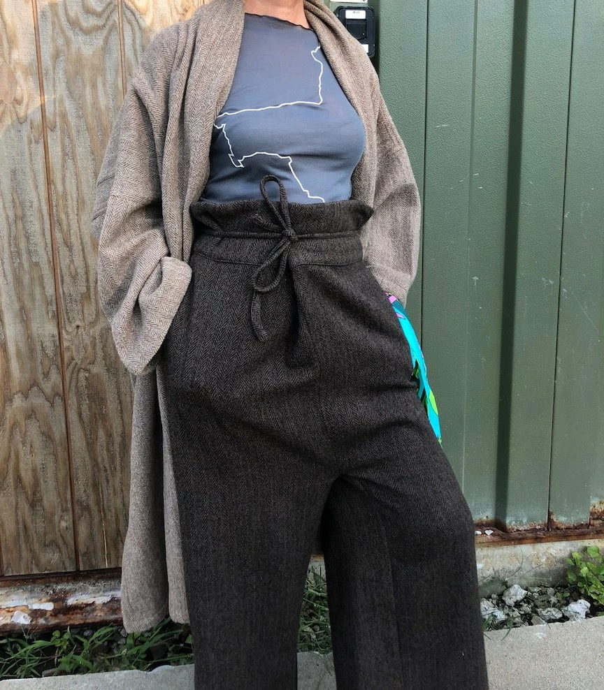A wide leg pant with a single folder over snap waist closure and an attached tie belt.Β