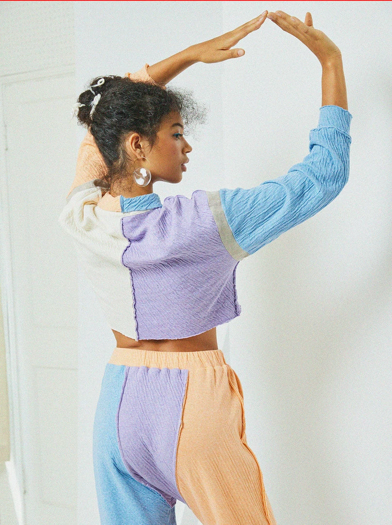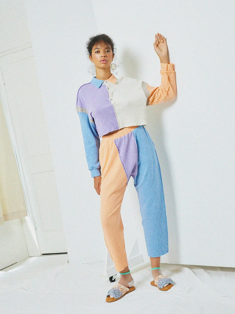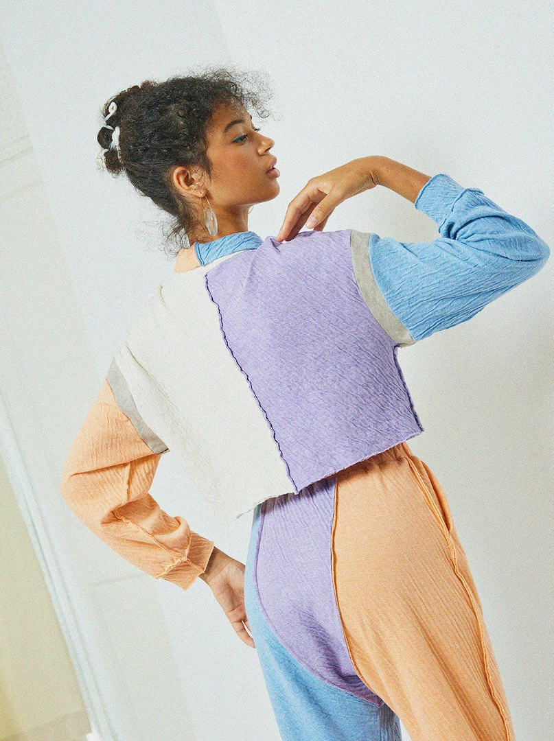 A top constructed of a super soft double layered soft knit textured cotton, small collar and button placket, alternating exposed raw seam details, cropped in the body