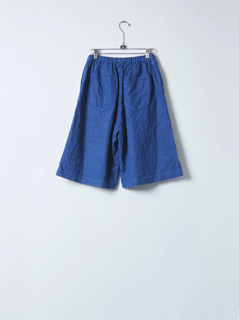 A long shorts that lands below the knee, with an elastic waist, 4 pockets, made from the same indigo fabric as the Haori Coat patchwork, one of Yuka’s signature pieces.Β