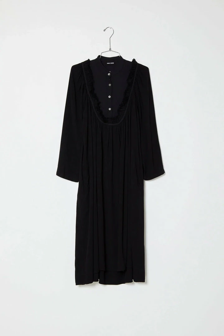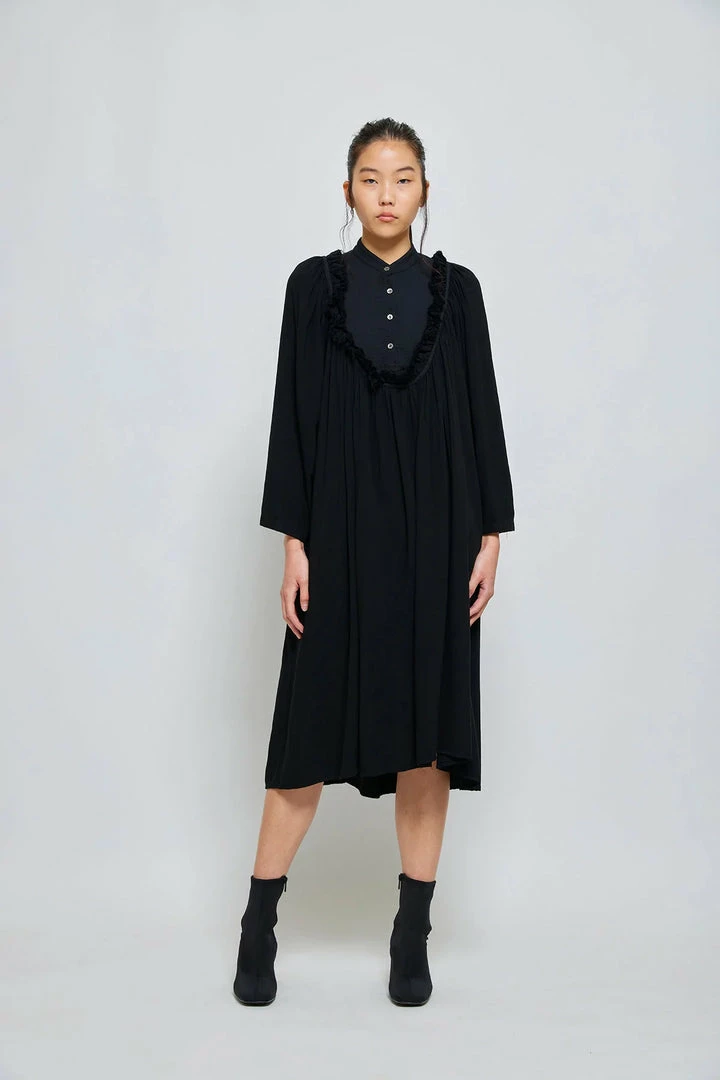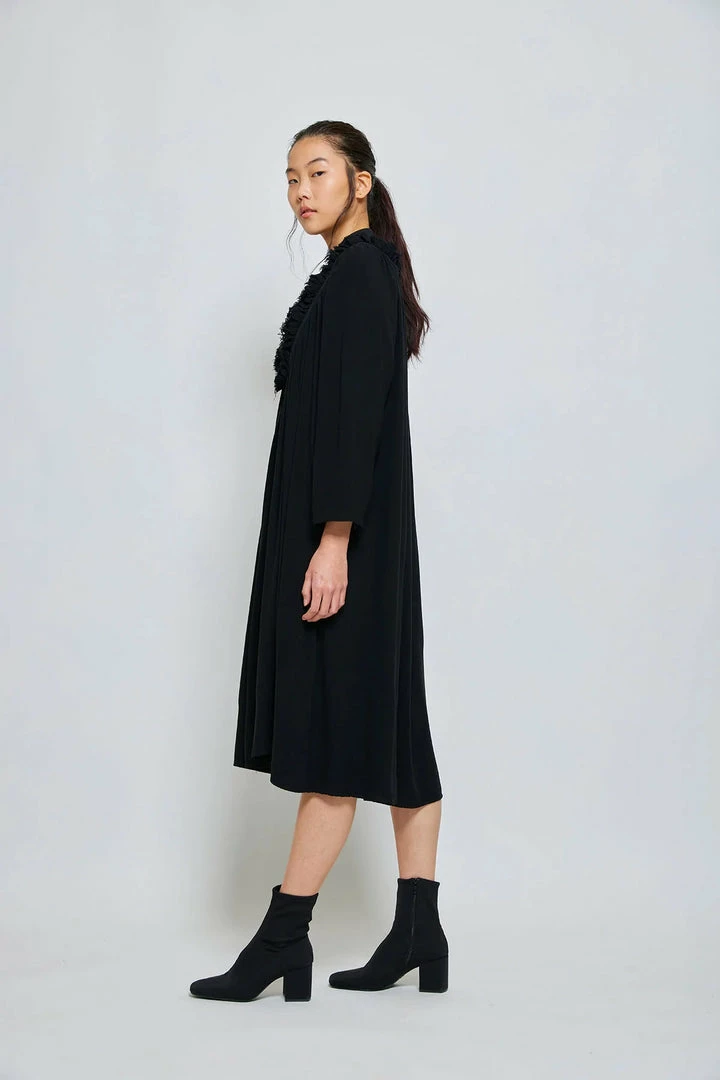 A super soft flowing drape dress with a bib button front w/frilled hem, side pockets