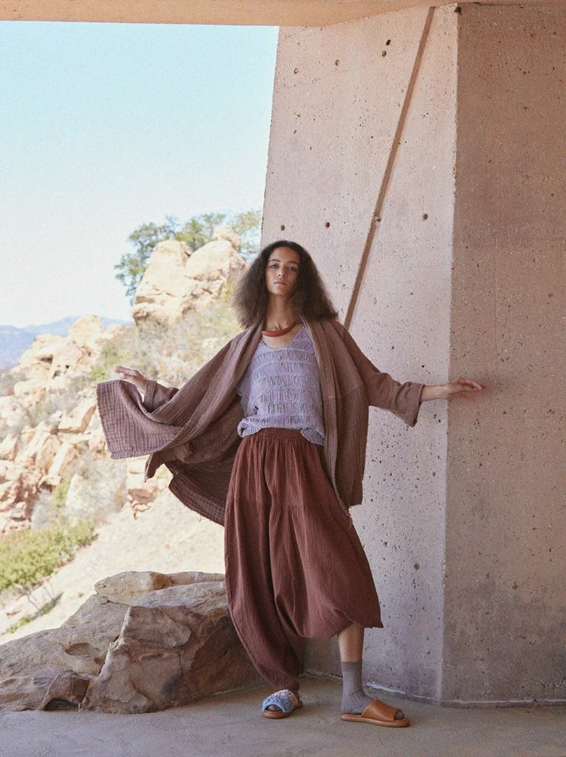 Yuka’s classic Haori coat in a contrast fabric construction, the traditional heavy gauze next to a 5-layer fine gauze fabric. 2 hand pockets, bottom hem fray details