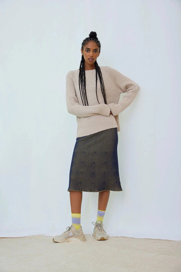 A flowy mid length skirt in a sustainable fabric, vertical rib that shows the contrast of colors when moving and stretching