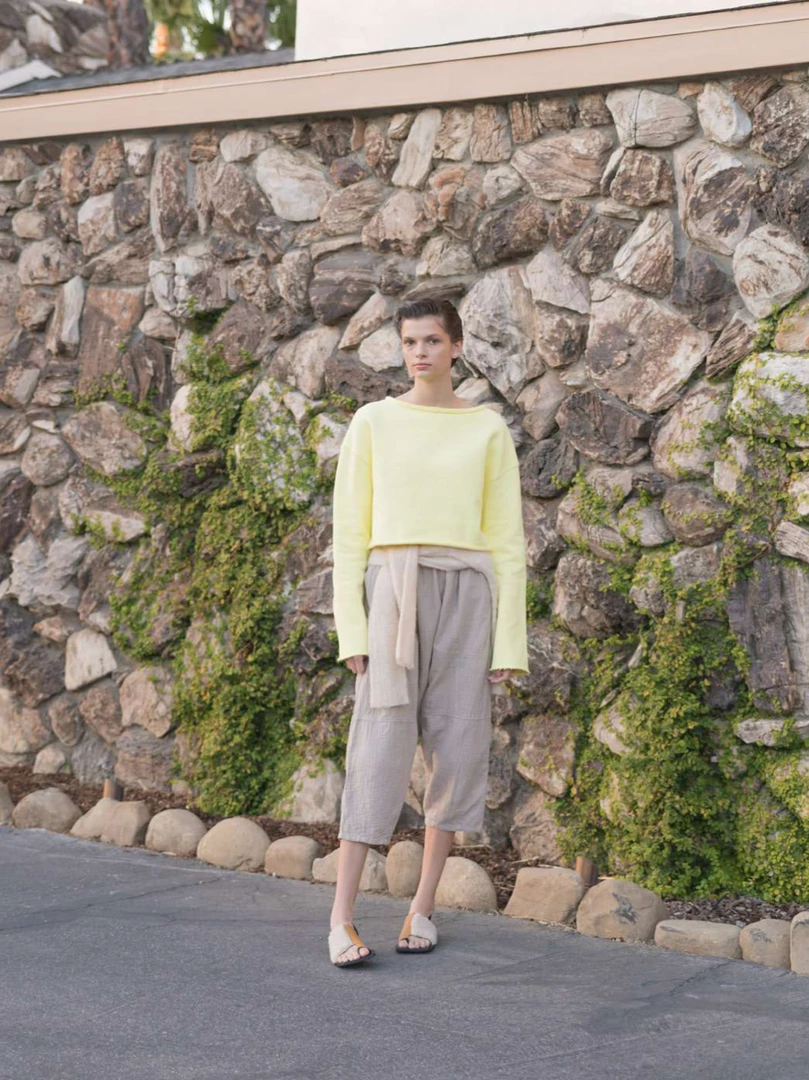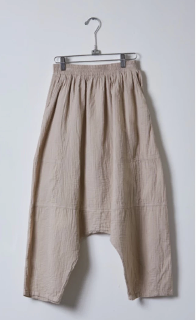 A Japanese crikle-cotton elastic waist pant that can be worn high or low, cropped length, side seam pockets