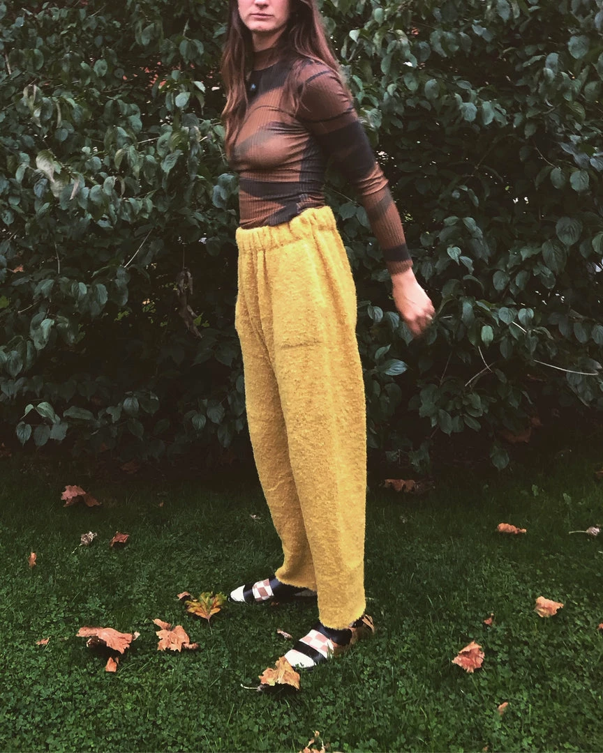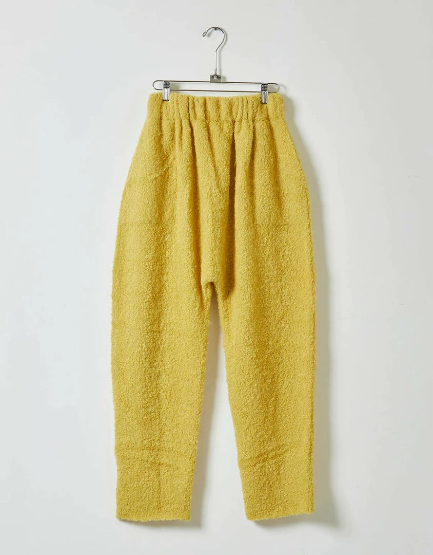 A boucle yarn knit pant with a comfortable elastic waist and 2 side hand pockets