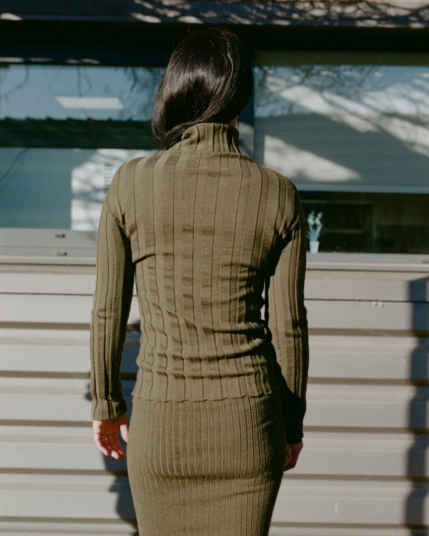 A super soft wide rib merino wool turtleneck sweater.