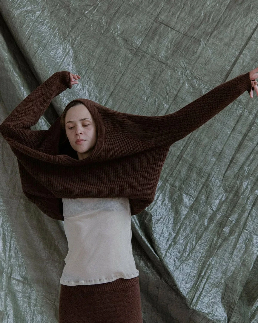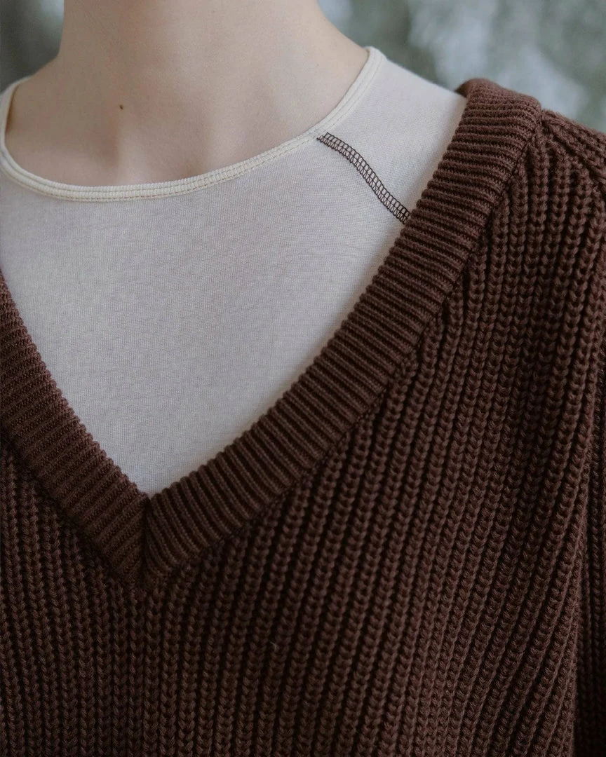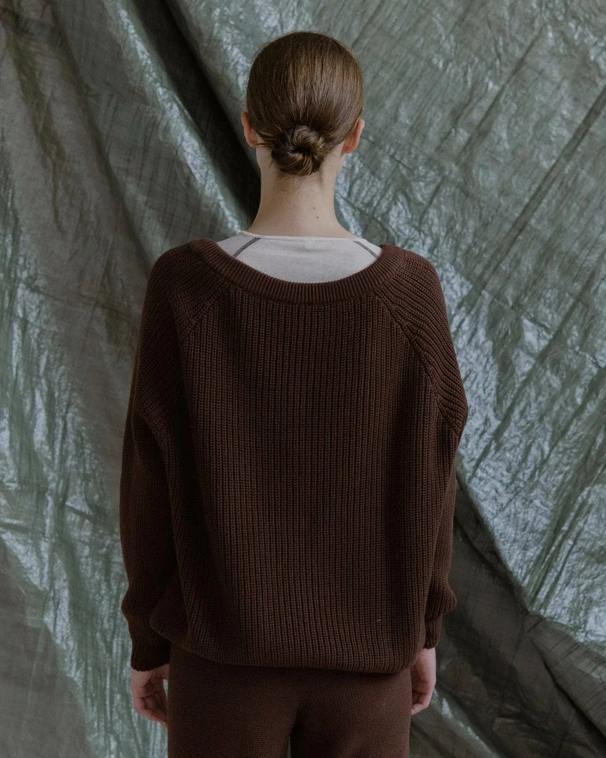 A cotton raglan knit pullover sweater with a deep V neck that can be worn front or back