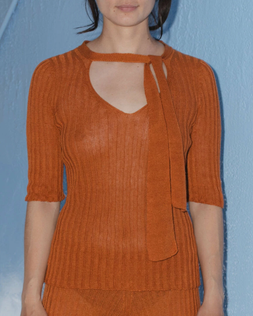 A pretty linen intricate-knit ribbed top with a neck-tie detail