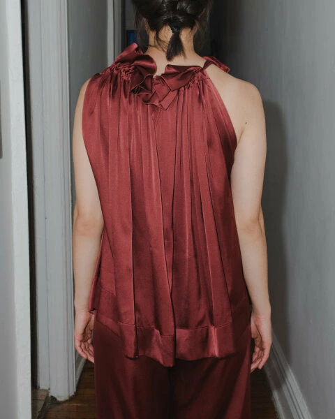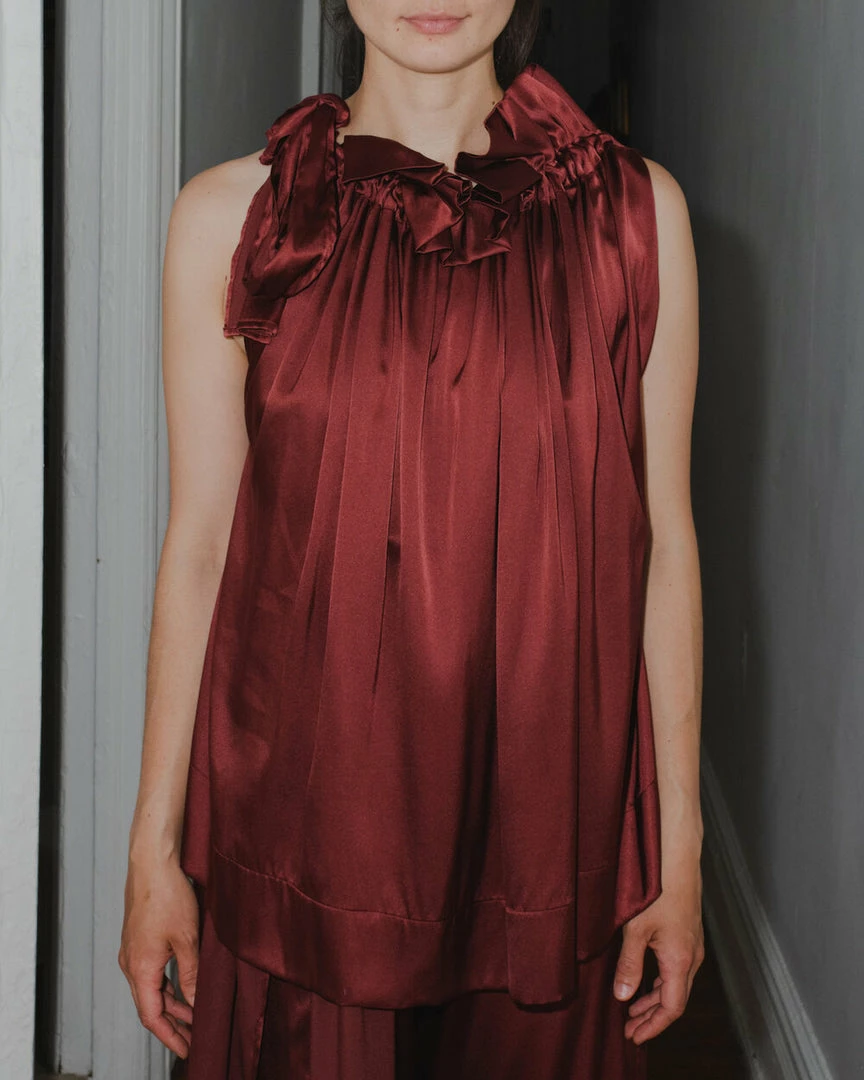 A sleeveless silk satin top in a rich deep Auger red, ruffle collar detail that adjusts, cinches and ties