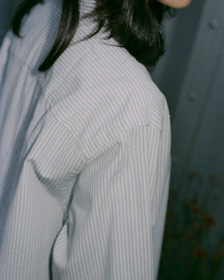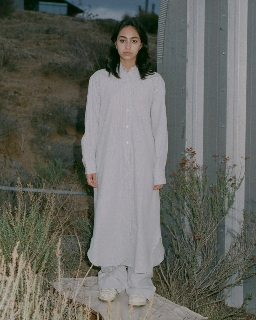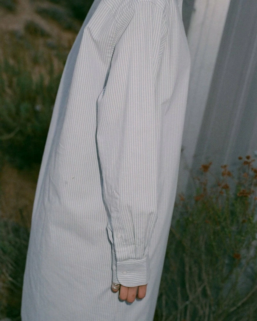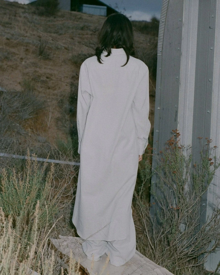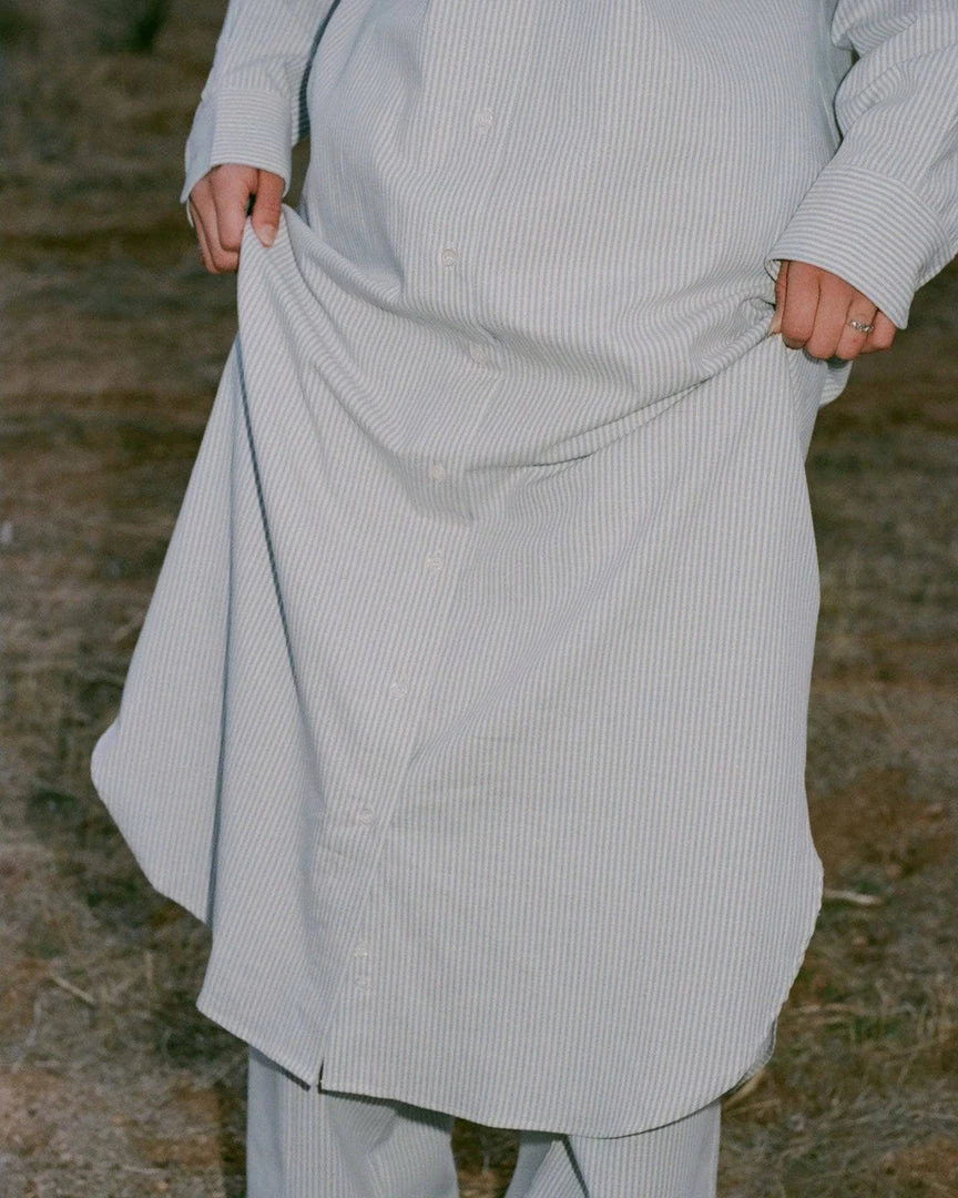 A long organic cotton shirt dress with a vertical stripe