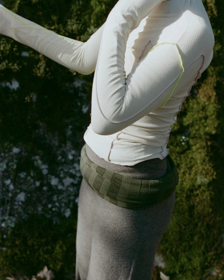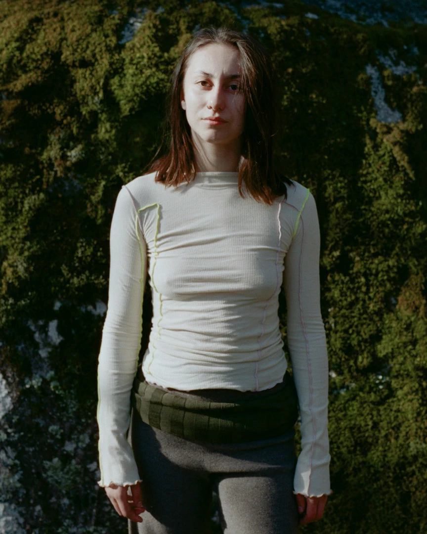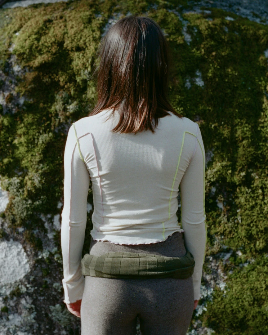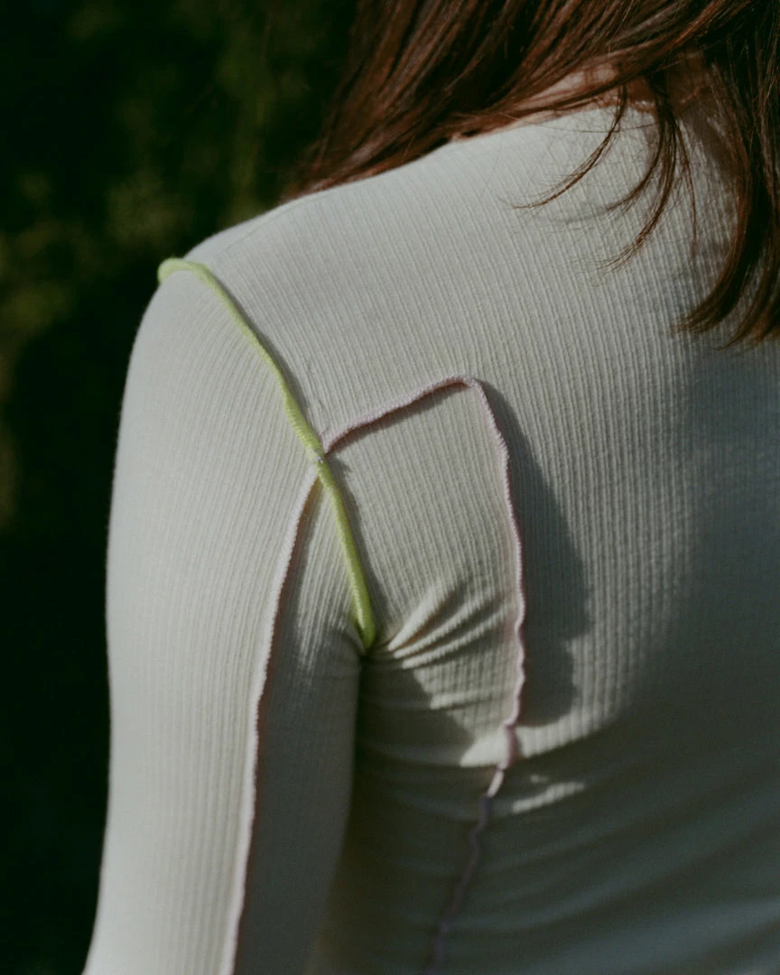 A long sleeve vertical ribbed tee of undyed organic cotton with contrast dyed seam and edge details