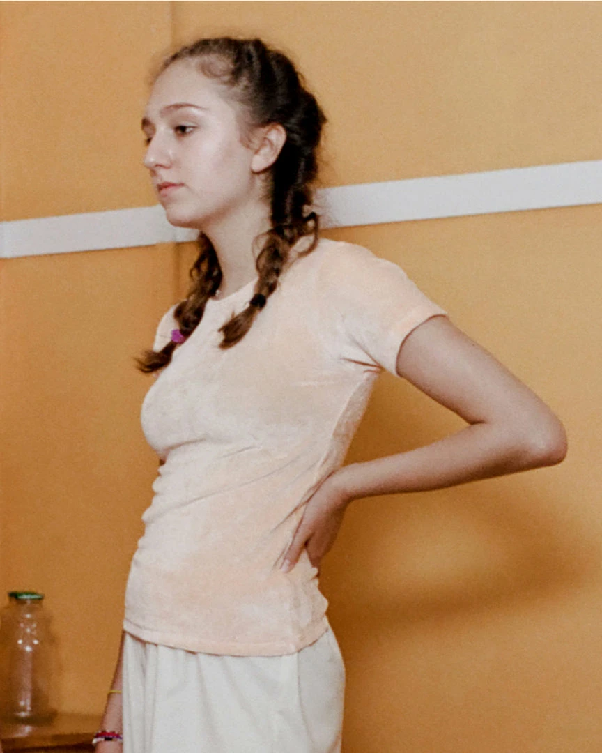 A soft and stretchy velours tee, sized to be fitted