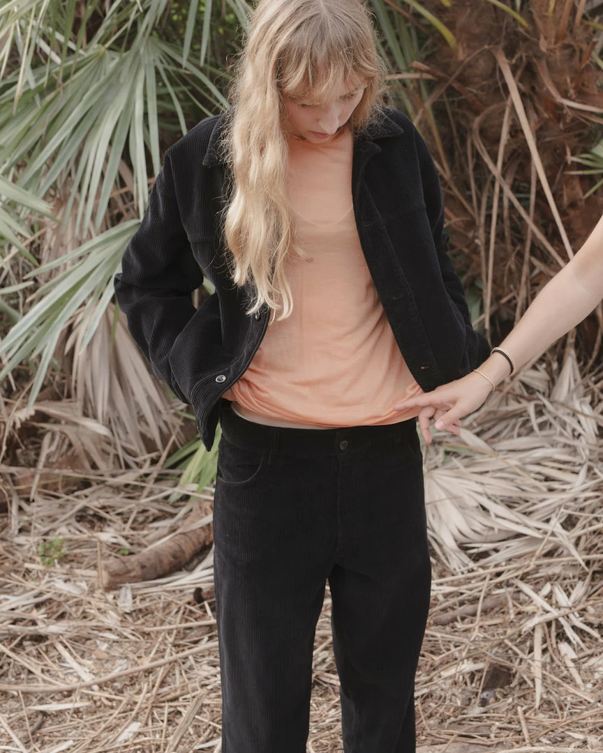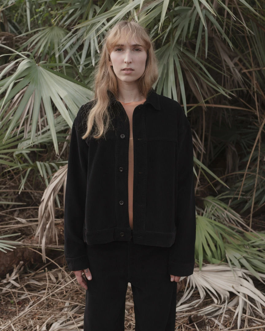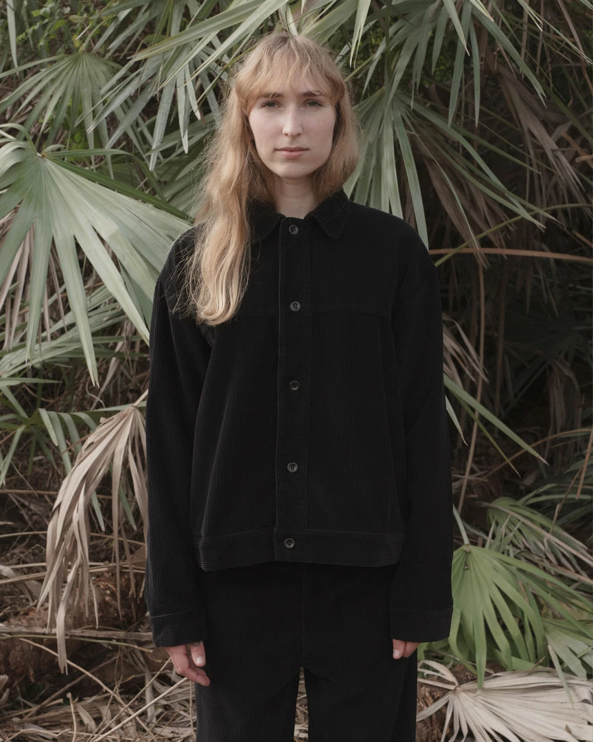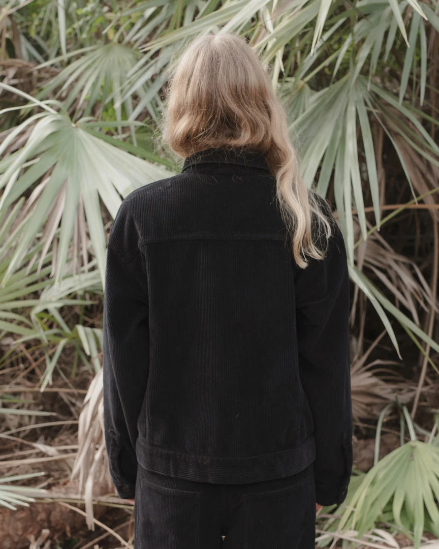 A black cotton corduroy jacket, full button front, button cuffs, and 2 side hand pockets