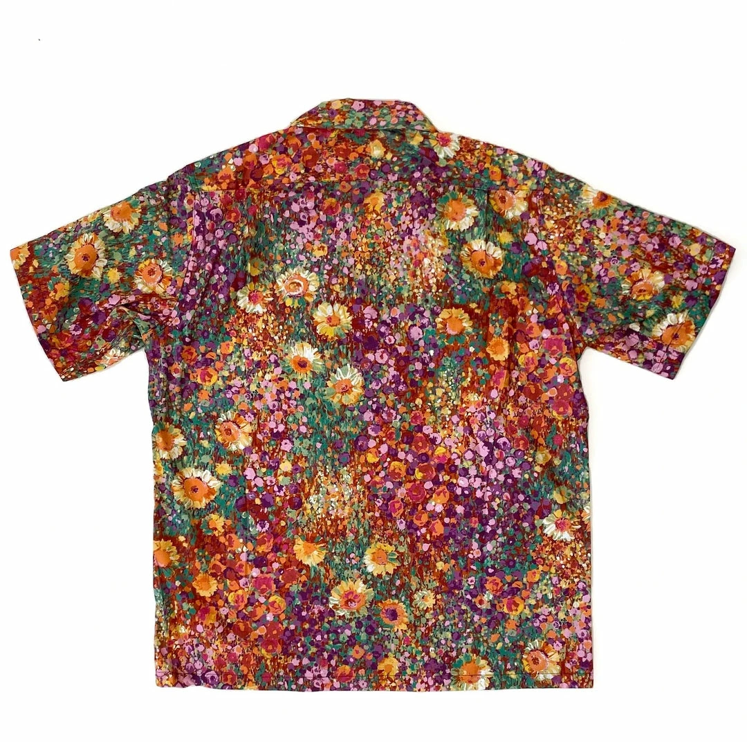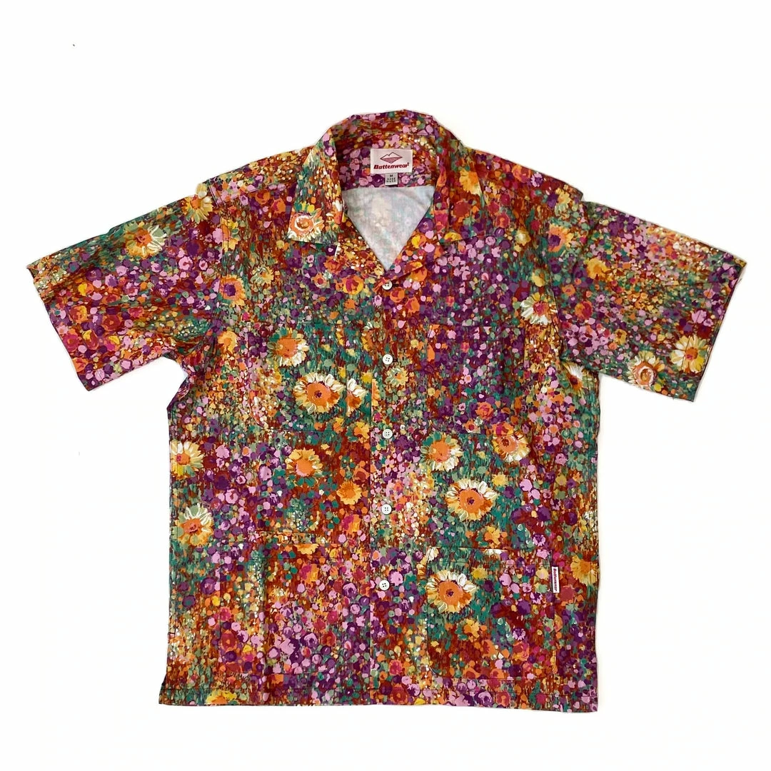 A short sleeve cotton button up shirt with a 5-pocket front, straight cut bottom hem with side slits, relaxed boxy fit