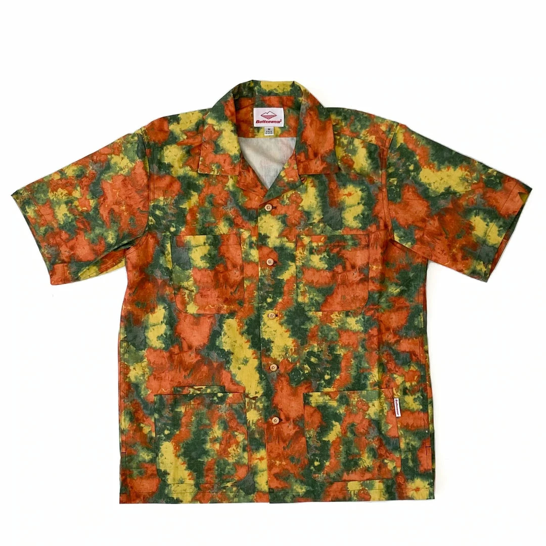 A short sleeve cotton-linen blend button up shirt with a 5-pocket front, straight cut bottom hem with side slits, relaxed boxy fit