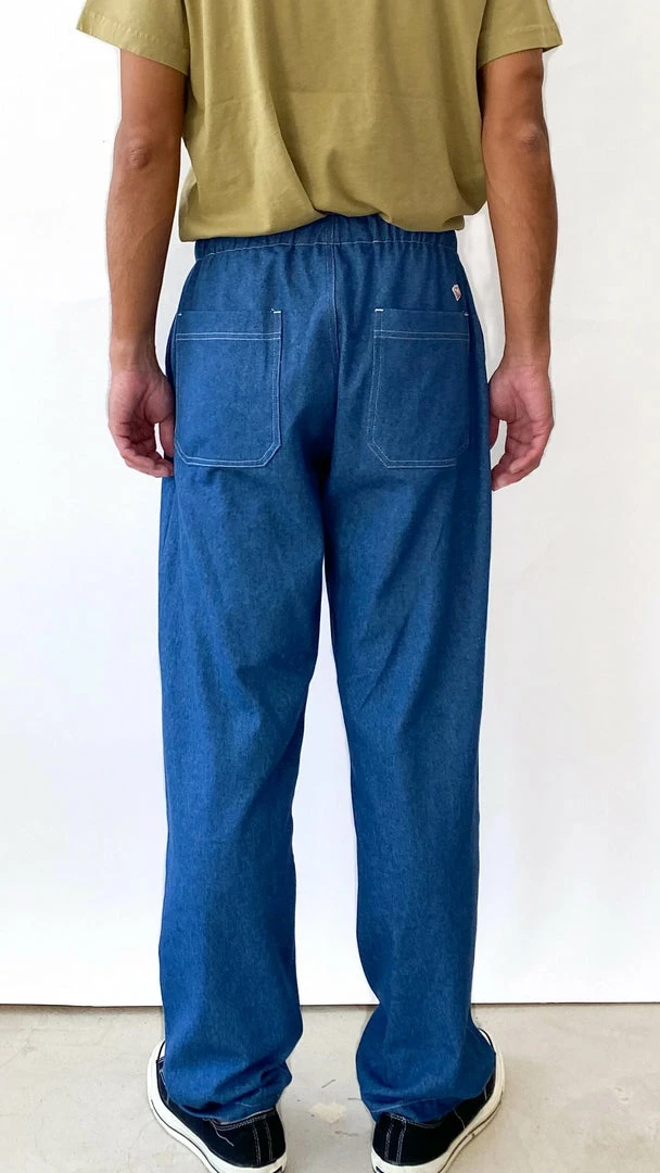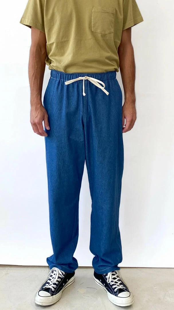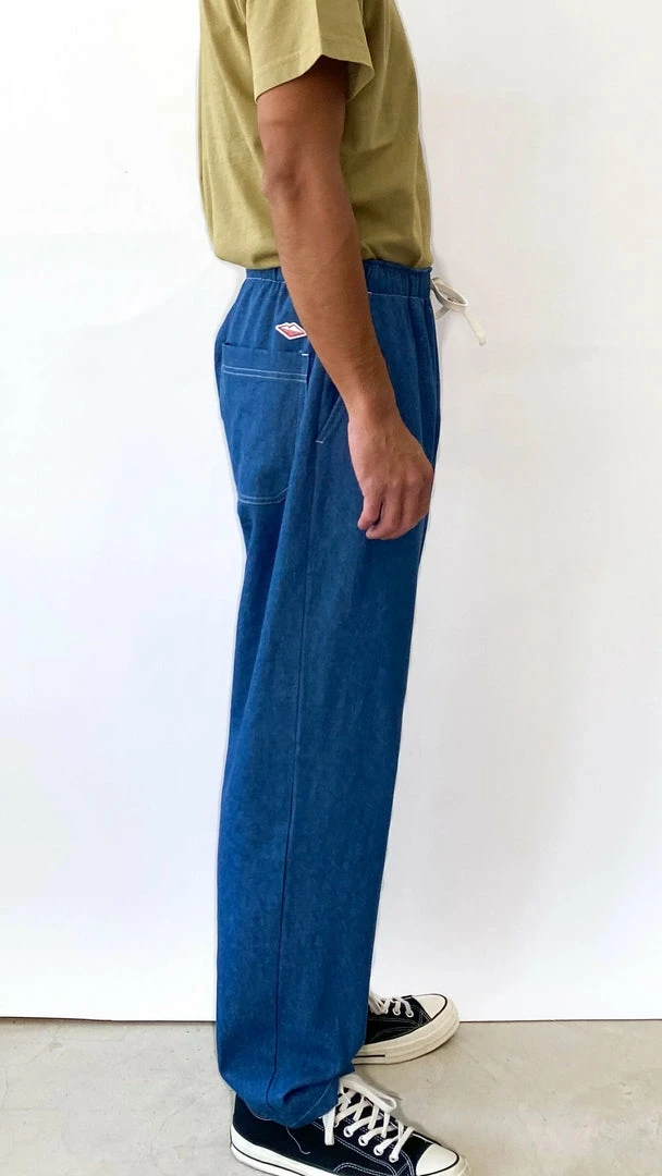 Our favorite versatile and comfortable Active Lazy pant by Battenwear in a new 8 oz denim. Elastic waist with drawstring, 4 pockets.