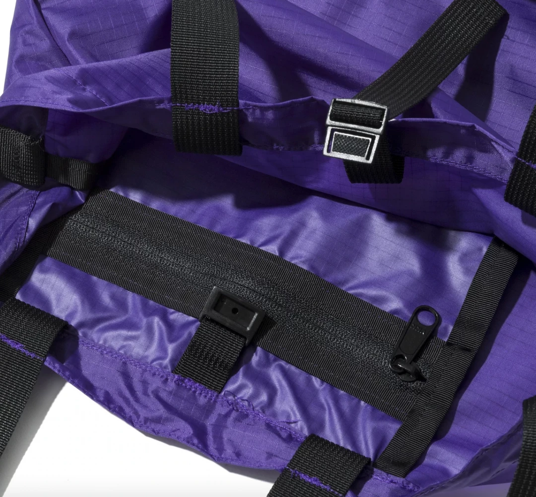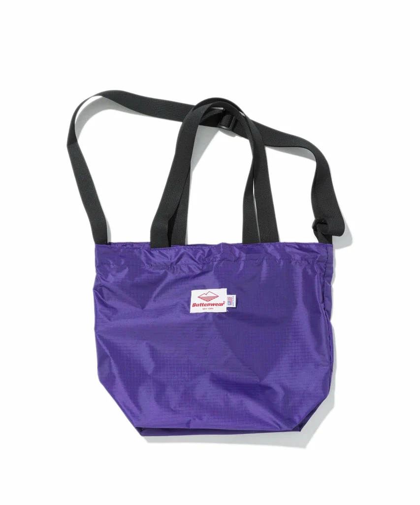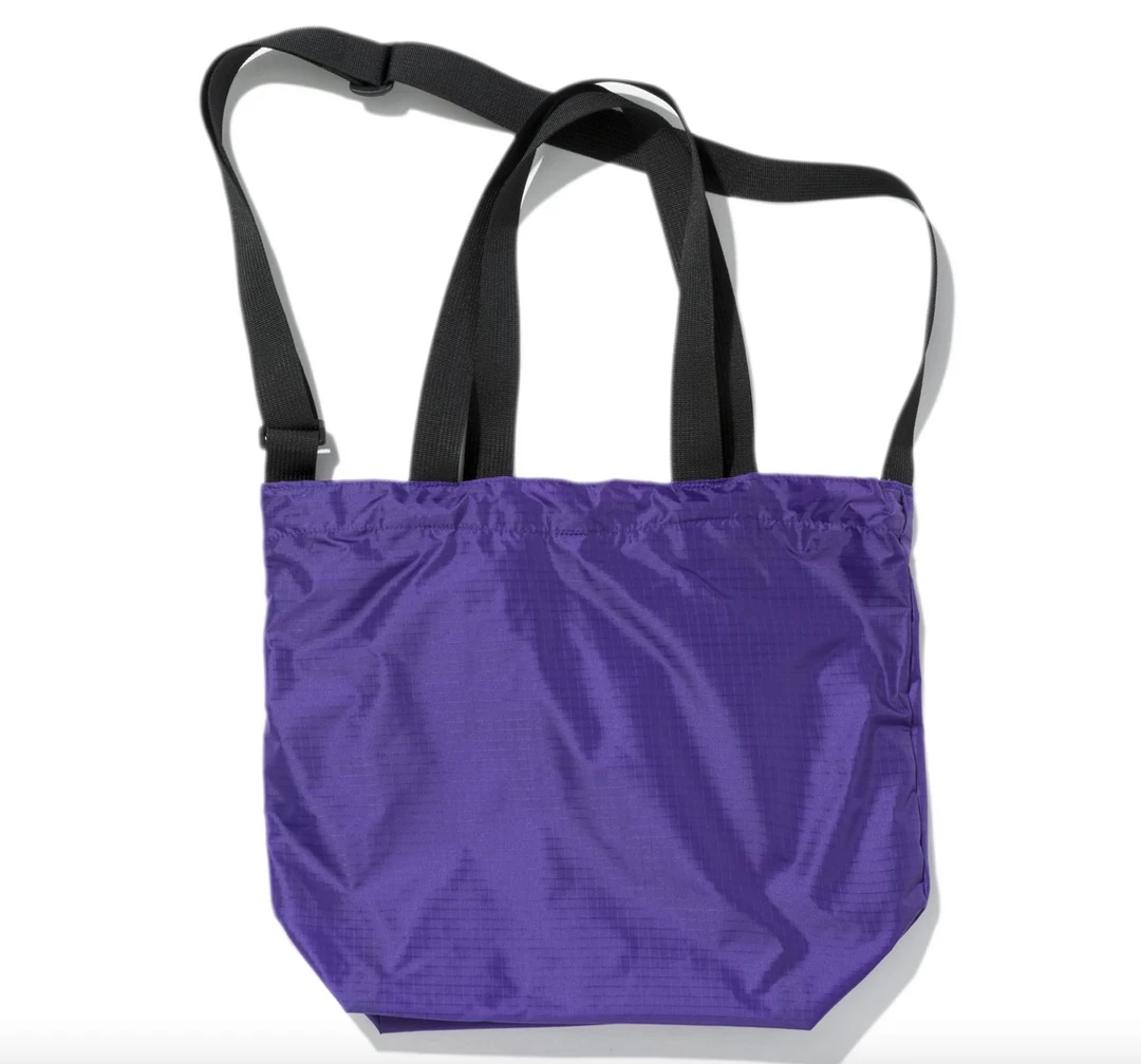 A ripstop nylon tote with an adjustable cross body strap and tote handles, and interior zip pocket with the entire tote can pack into.Β