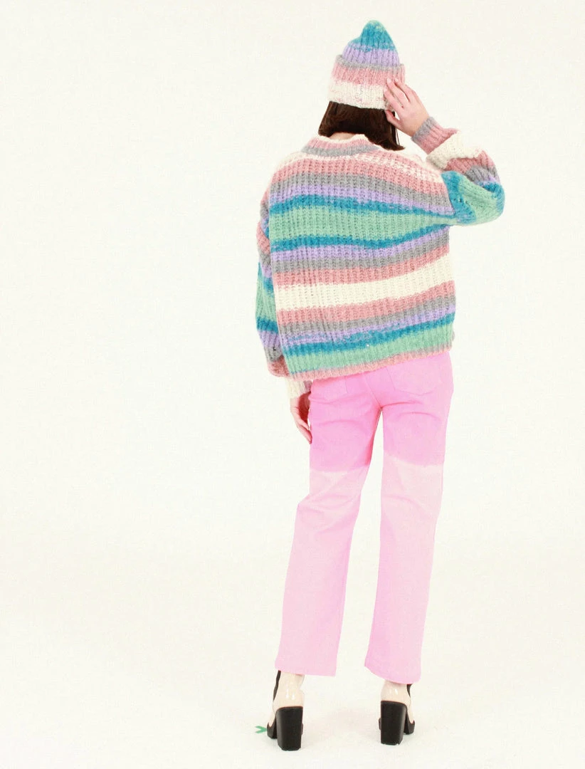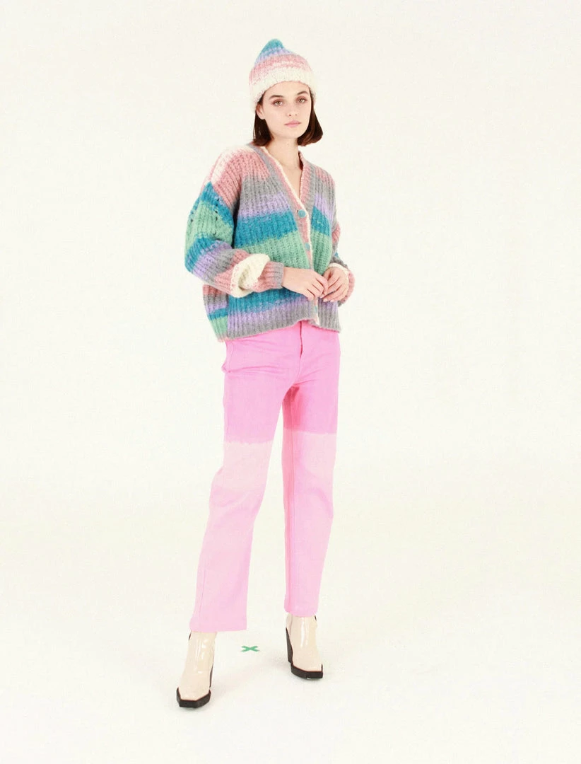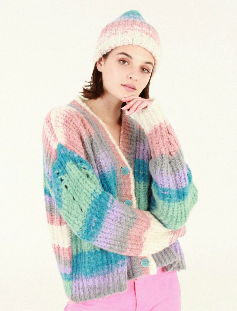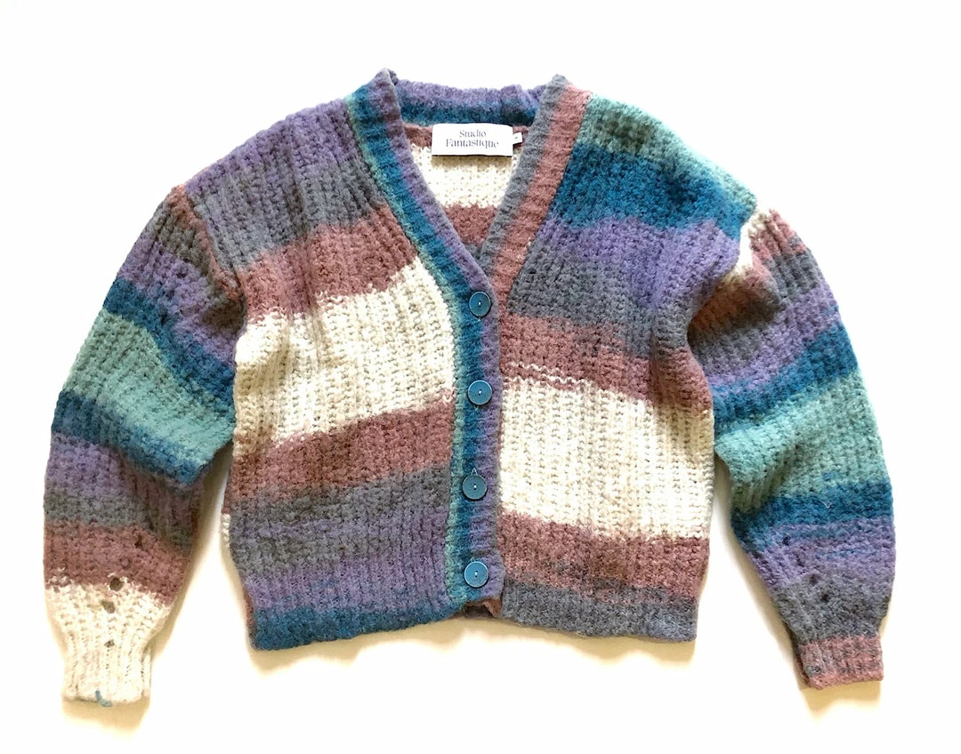 A soft chunky knit cardigan with a drop shoulder and boxy fit, and a “soft volume” on the sleeves, giving the sleeves a perforated line design in a few spots