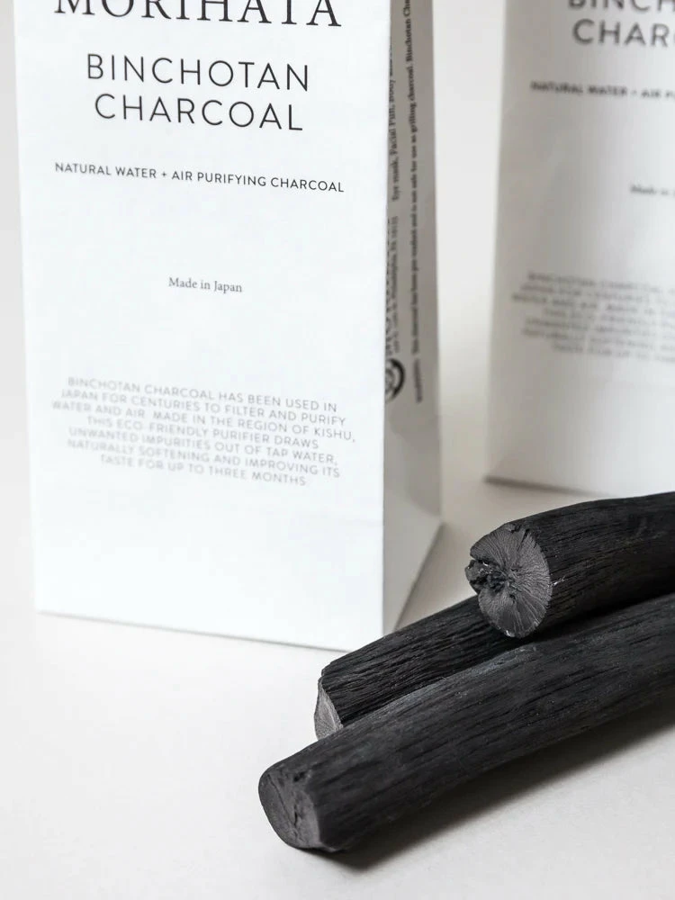 2 Charcoal sticks made from 100% ubame oak, to be added to a carafe of water where the thousands of microscopic cavities in the charcoal will hold and remove unwanted toxins and impurities from drinking waterΒ