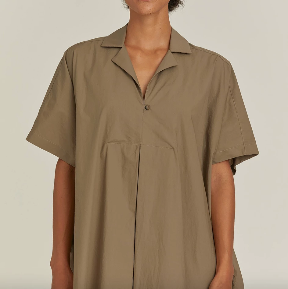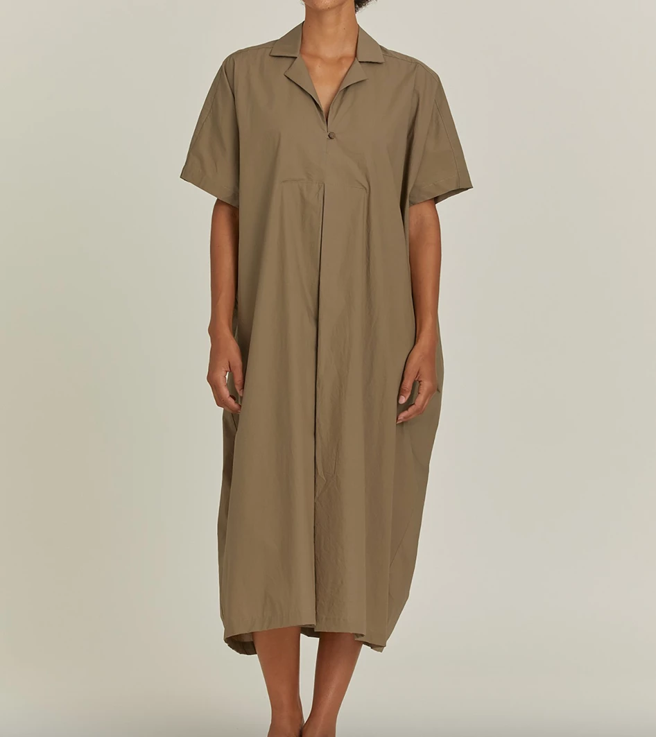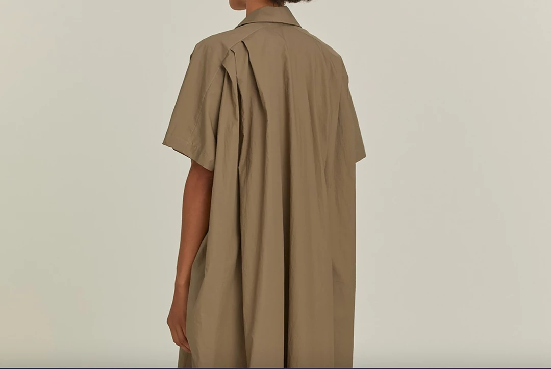 A relaxed fit lightweight cotton dress in a sharp stylish cut, flattened collar and inverted pleat front with button detail, creased back pleats, and side pockets