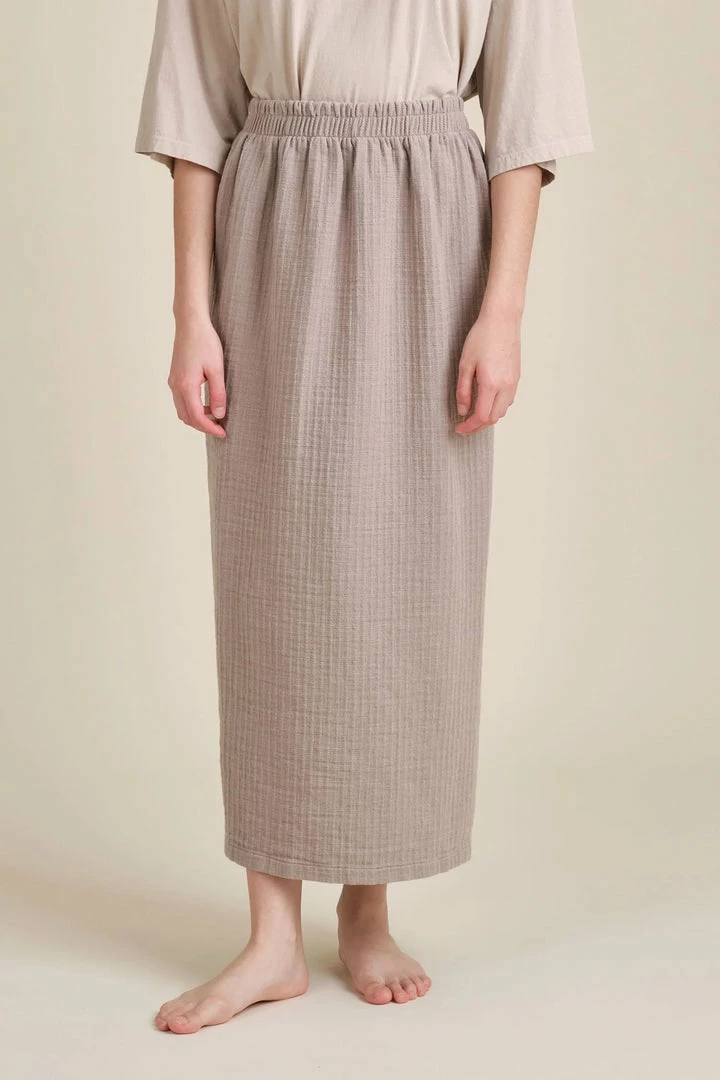 A long relaxed skirt in a textured cotton linen blend, with a comfortable elastic waist and lower back slit