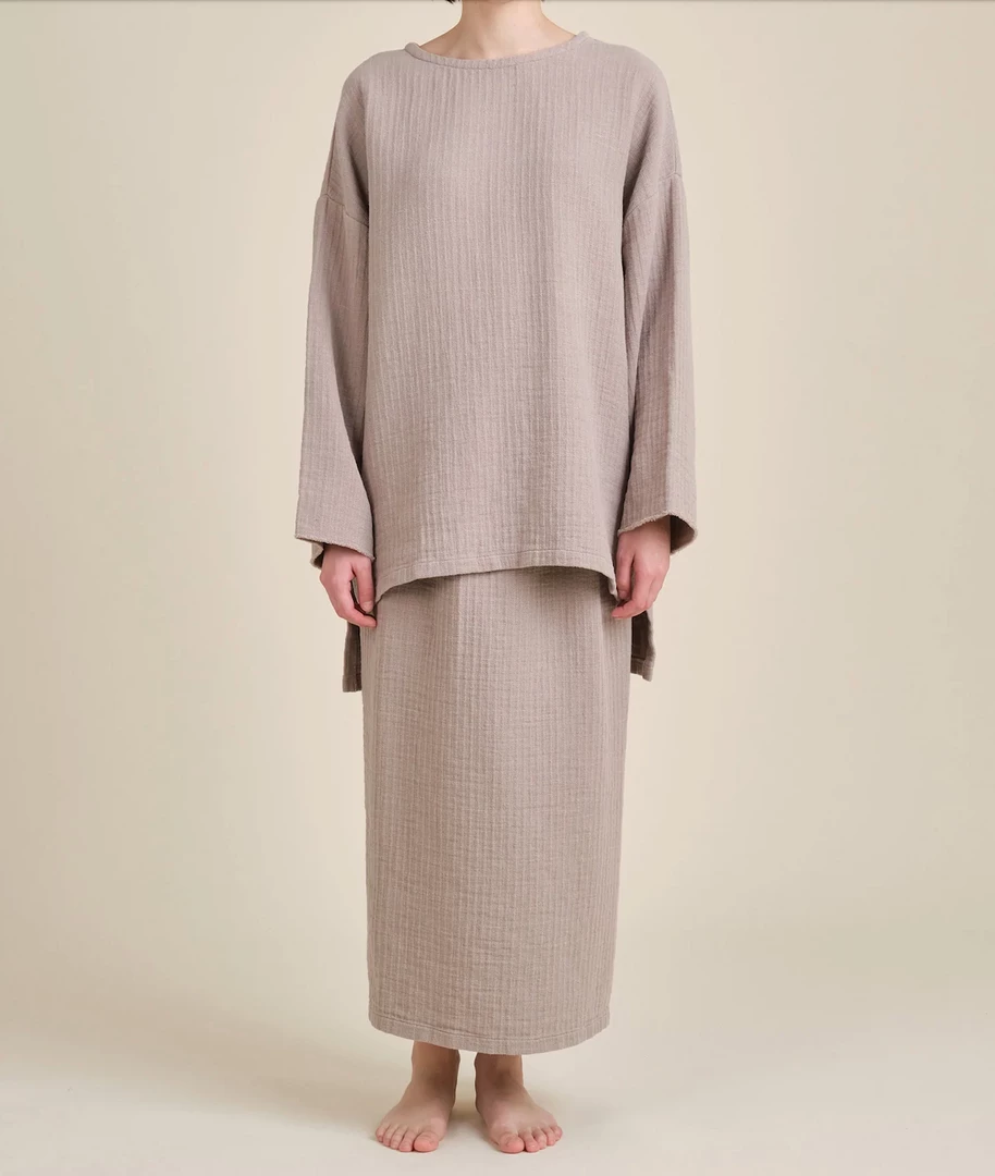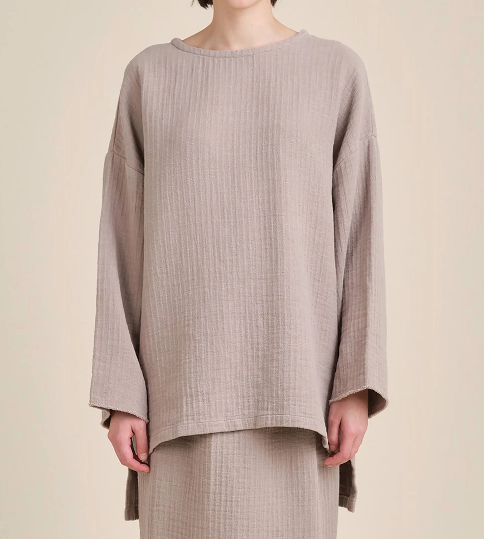 A relaxed fit textured pullover with a crew neck, drop shoulder, side seam bottom slits with a lower back tail, and frayed cuffs
