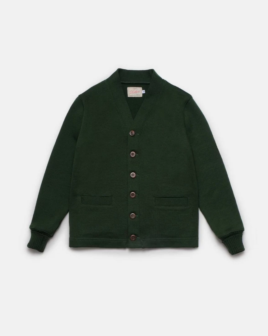A heavy worsted wool 1950’s style cardigan with a 6 custom Corozo button front, 2 welt front pockets, extra long cuffs to roll back if intended