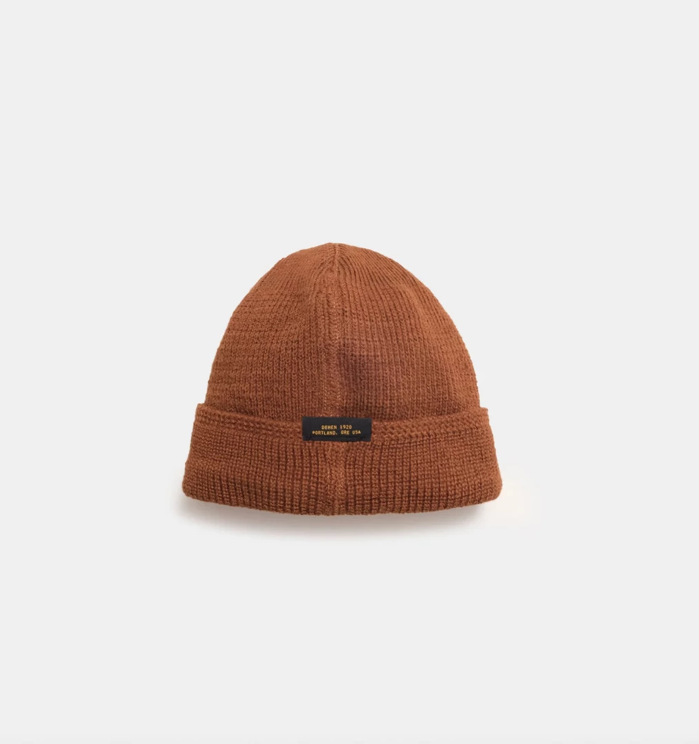 A wool 6 gauge knit cap, 6 seam top construction and a subtle accent stitch at the edge of the cap cuff with a black & gold label