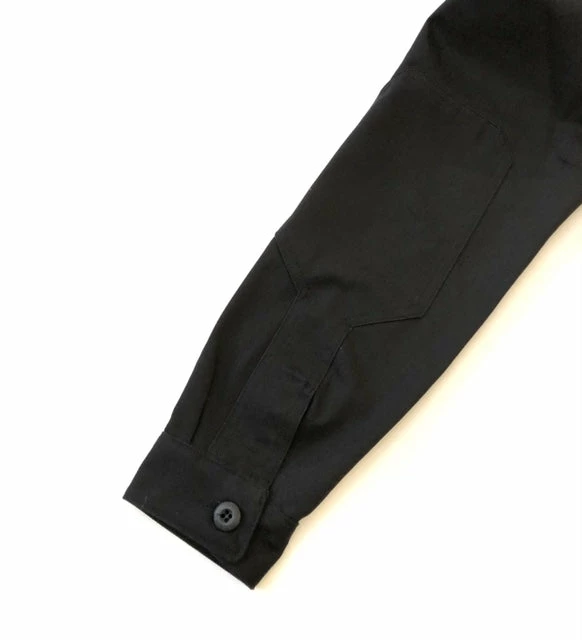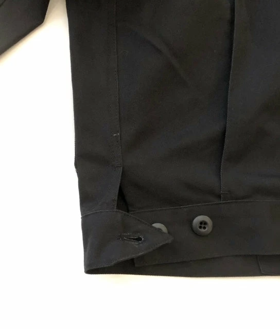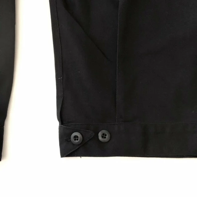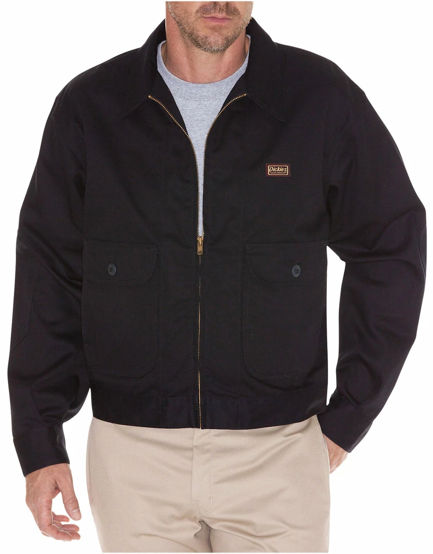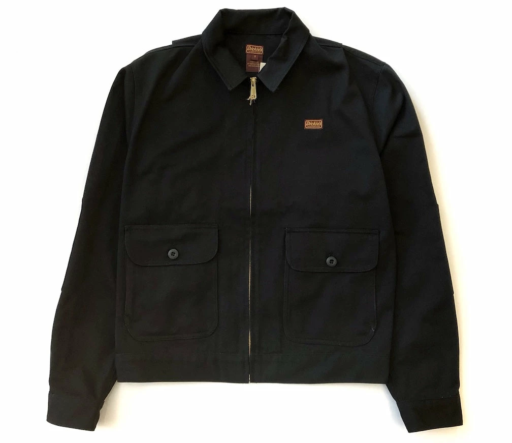 A cotton duck waist-length jacket with dual entry front pockets with a button closure top, and open side entry to another portion for hands. Full zip front, 2 full back shoulder to waist horizontal pleats so the piece is easy to work in, side seam hem adjustable button closures for fully opening the 3″ vertical slit or tightening the hem, reinforced elbow patches, button closure cuffs. Dickies logo patch at left chest.
