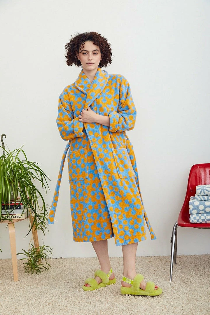 Solid weight brushed cotton terry bathrobe with contrast stripe inside and out, and contrast stripe belt