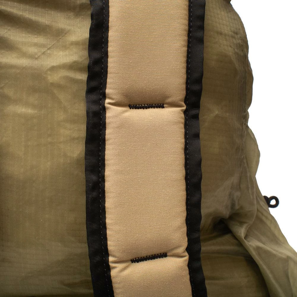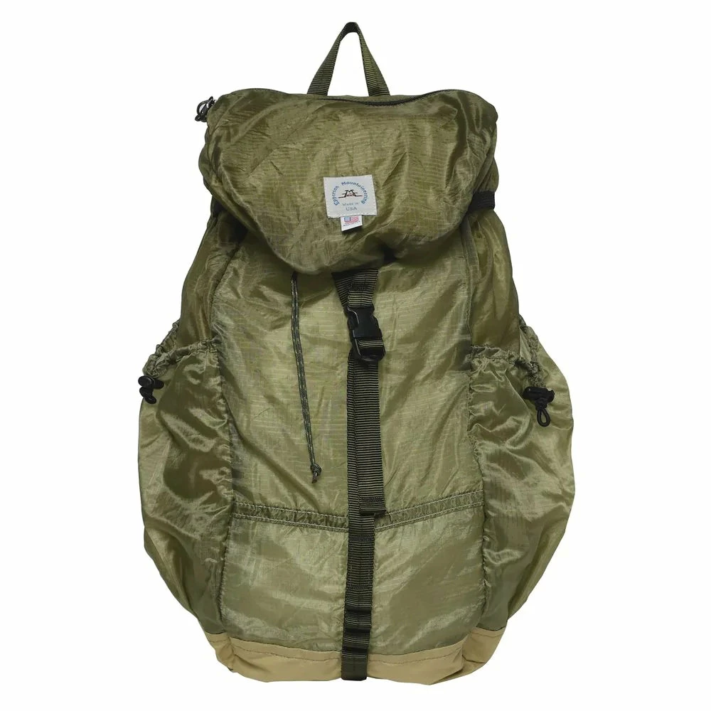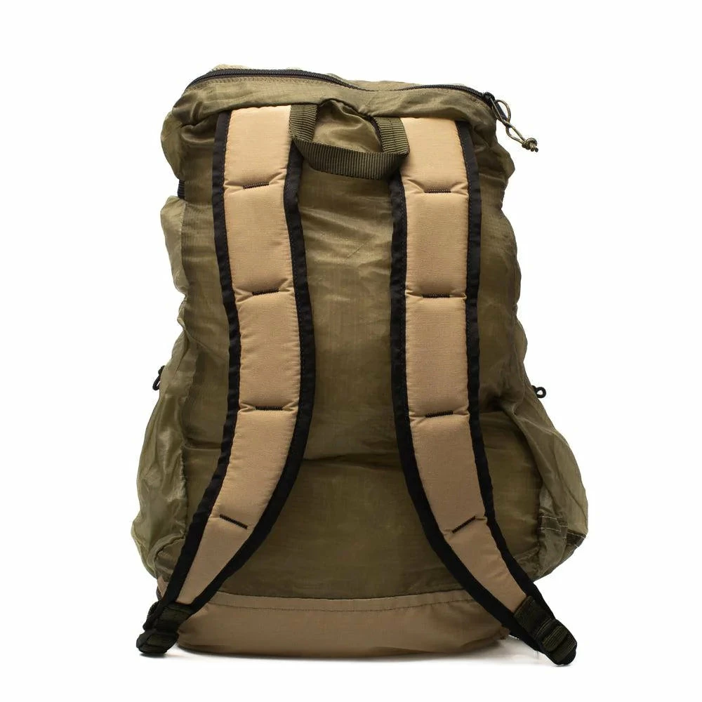 A collapsable and packable backpack made from vintage parachute fabric. One large main compartment with a drawstring closure & a fold over lid with a buckle snap closure, and a zip pocket on top. 2 side drop in pockets. Padded contour sleeves.