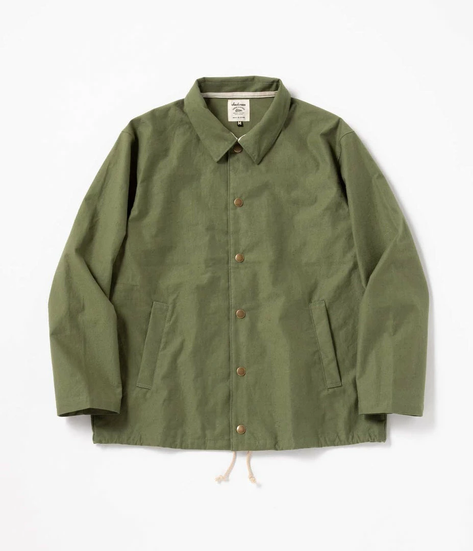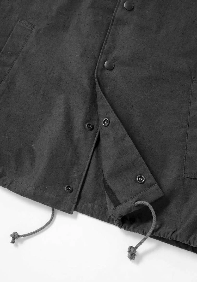 A high density organic cotton “nep” exterior jacket, snap button front, bottom hem drawstring, 2 hand pockets