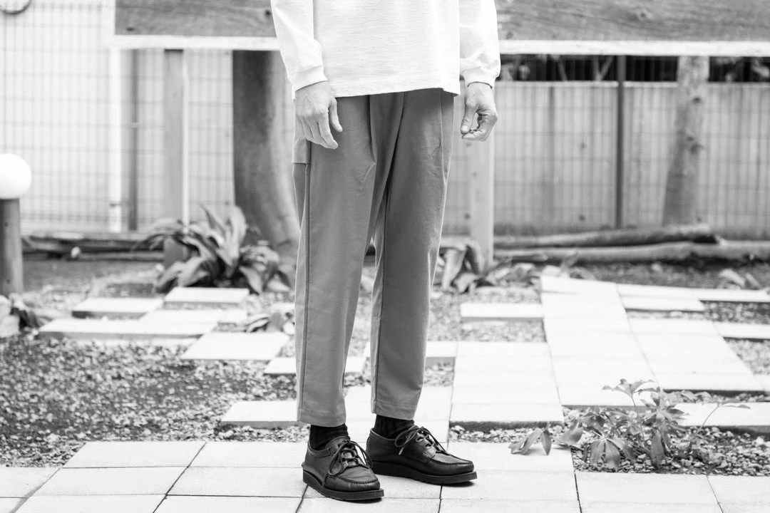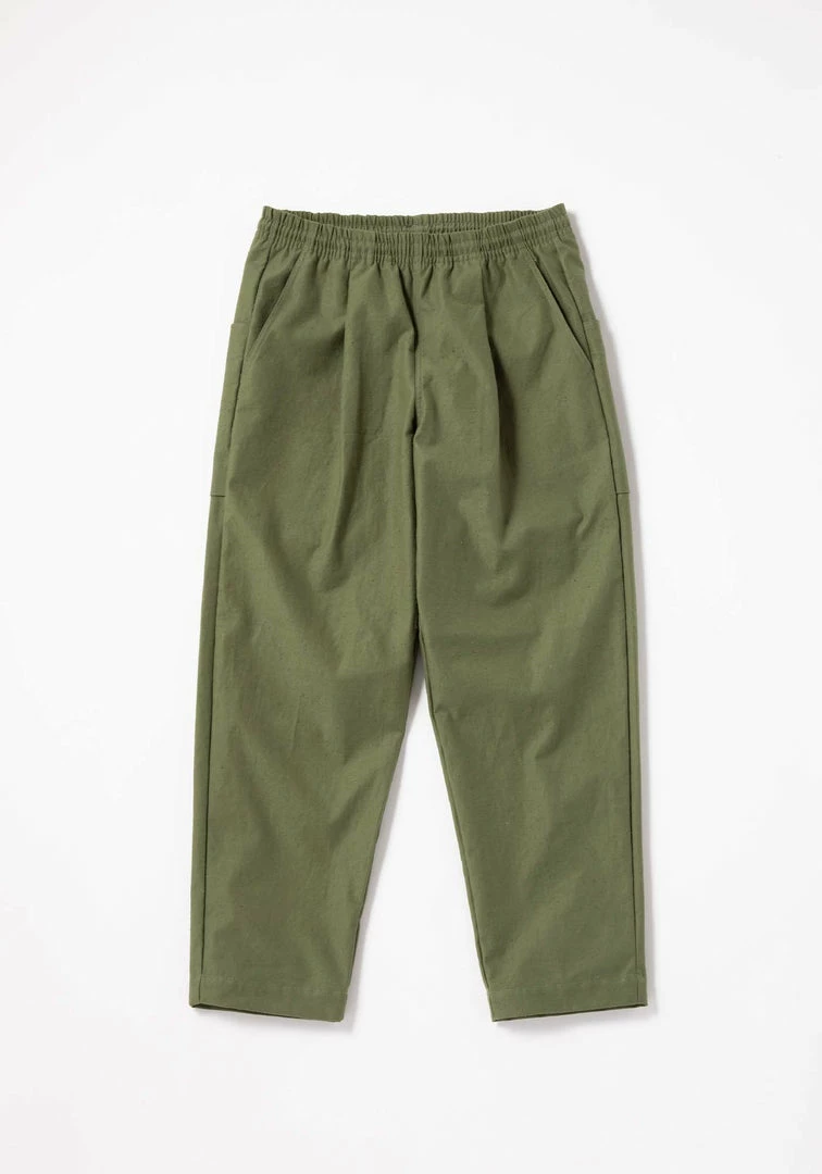An elastic waist, high density organic cotton, singleΒ pleated pant with front hand pockets and 2 extra large back pockets with a button closure, interior drawstring at waist. The cotton fabric has a “nep” quality to it’s exterior. The length of the pant is shorter that an average Jackman trouser, but not necessarily cropped. The fabric is firm and crisp.Β
