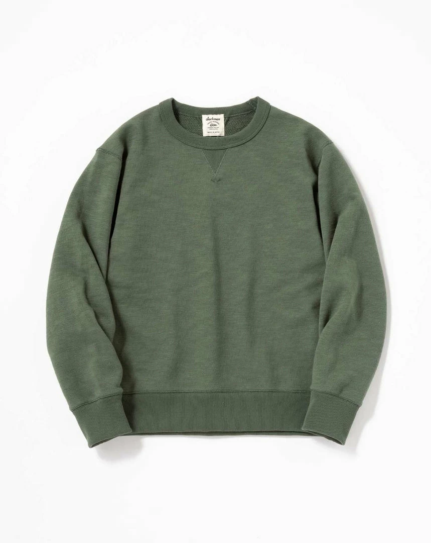A heavyweight crewneck sweatshirt in a seasonal color of ash green.Β