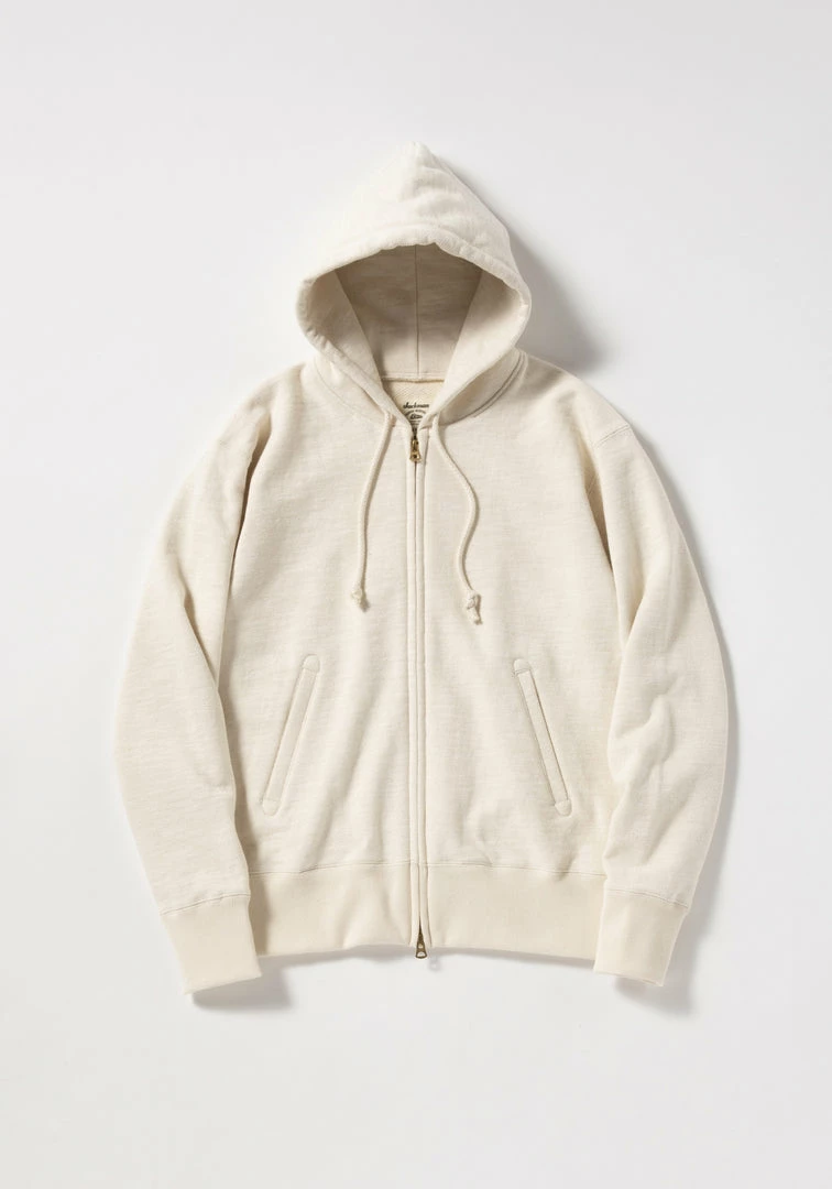 A heavyweight full zip hoody with hand pockets and hood drawstring. “GG” refers to the grainy pattern of the fabric achieved by using coarse decoratively twisted threads for the outer yarn. Always on point Jackman attention to detail construction, seams reinforced with covering stitch after ground stitching. 2-way zipper that will also open up from the bottom for ease of mobility.