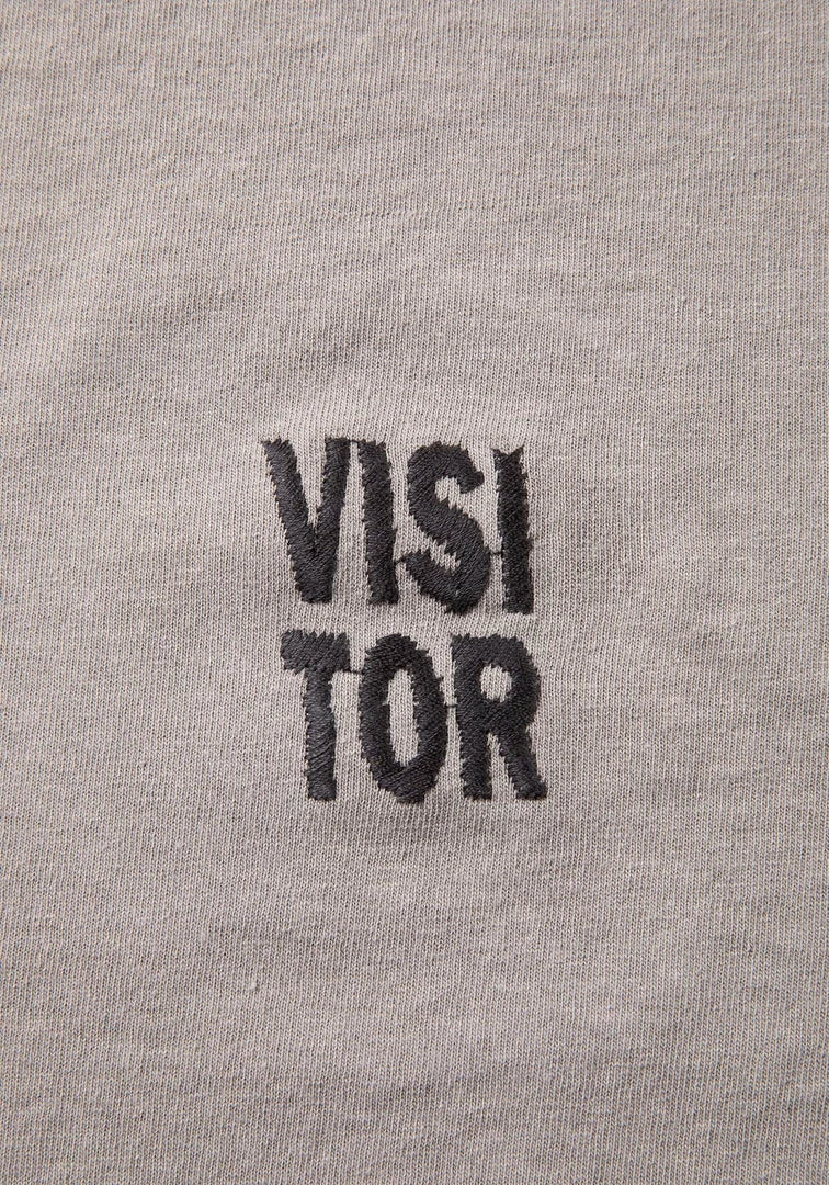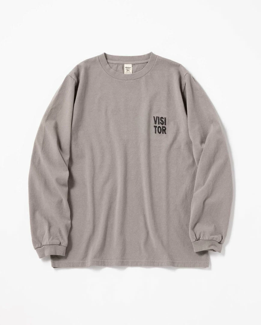 A long sleeve t-shirt with an embroidered “VISITOR” baseball team reference on the left chest. The t-shirt is made by spinning cotton thread with a variable width which gives the shirt a rugged and unique crispy texture