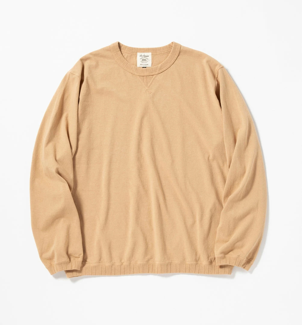 A long sleeve tee with rib details on the neck, bottom hem, and cuffs. Made primarily of US cotton spun at variable widths of 13mm-33mm which gives the shirt both a rough and crisp feel.