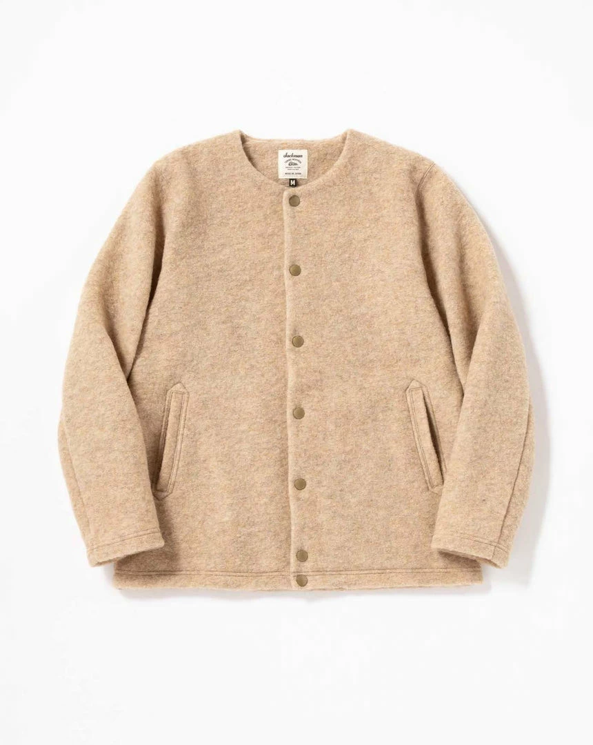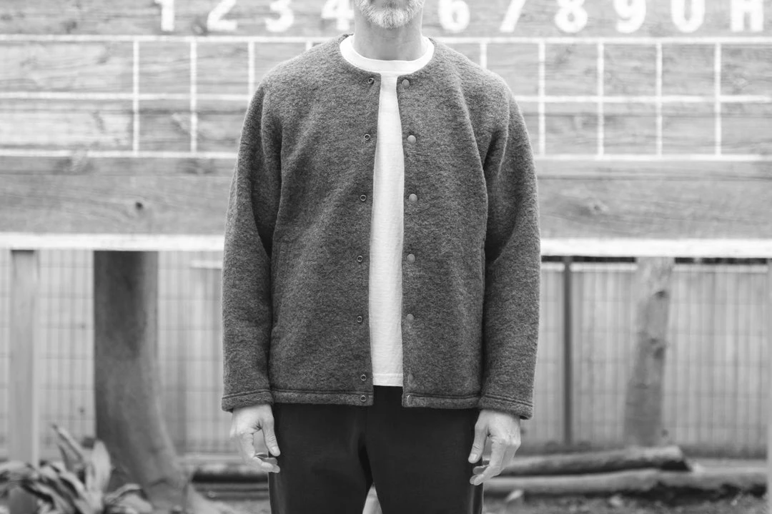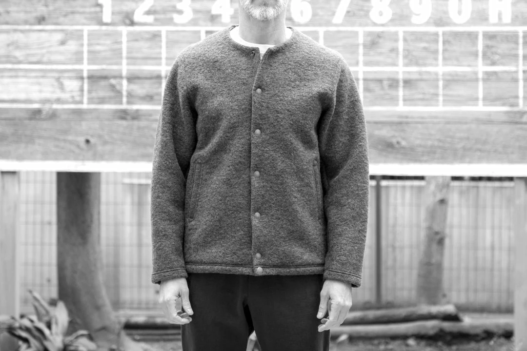 A Shetland wool zip jacket made of loosely twisted yarns so achieve thickness and retain heat inside the fibers. Front snap closure and 2 front hand pockets.