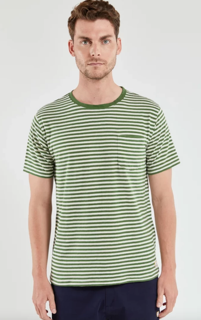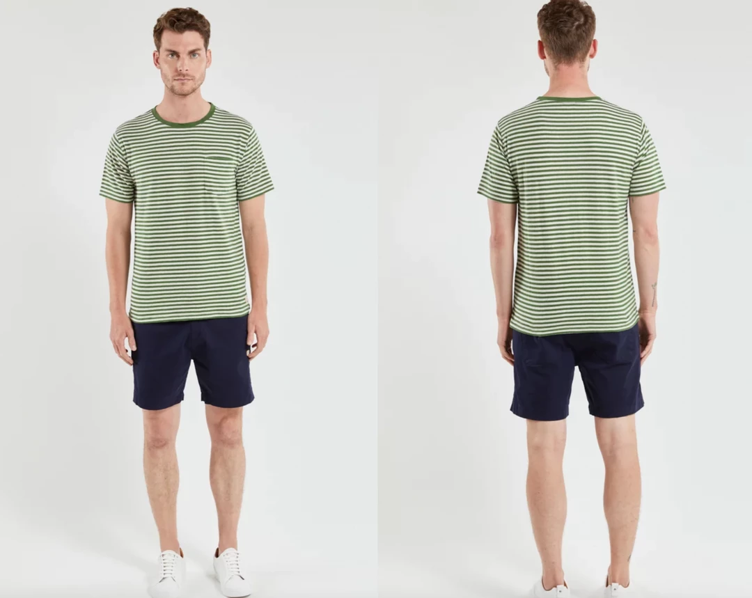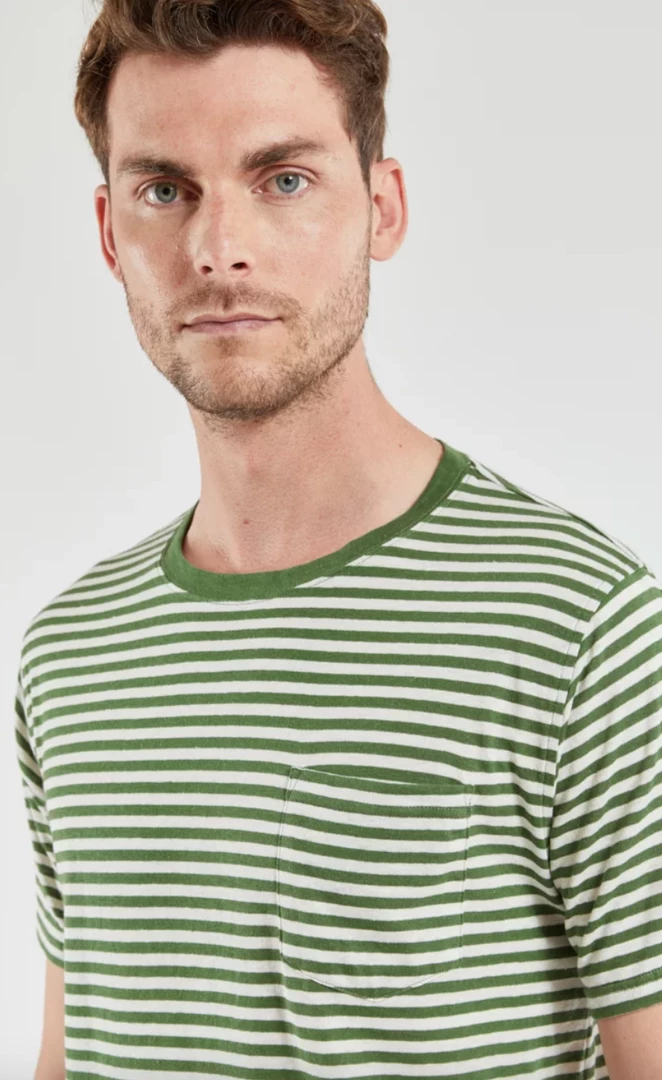 A sharp looking lightweight tee in a cotton-linen blend for the warmer months in a seasonal fine stripe of ficus green & natural. Armor Lux logo patch at bottom hem, left chest pocket