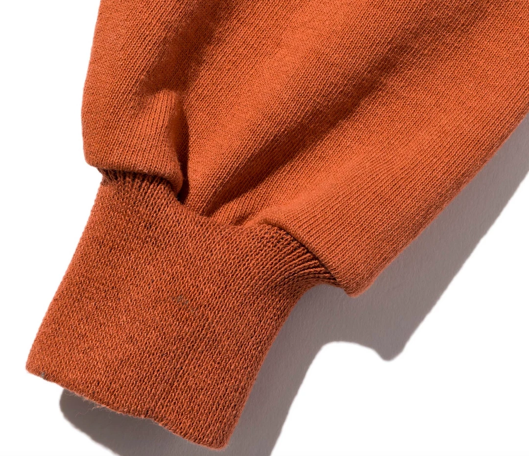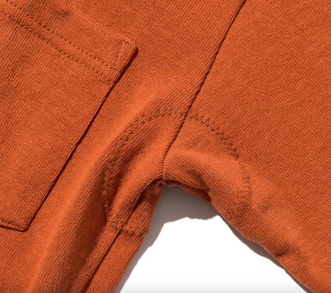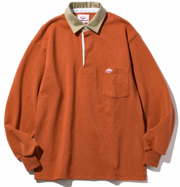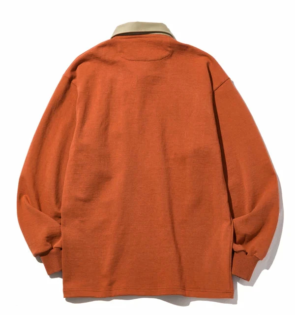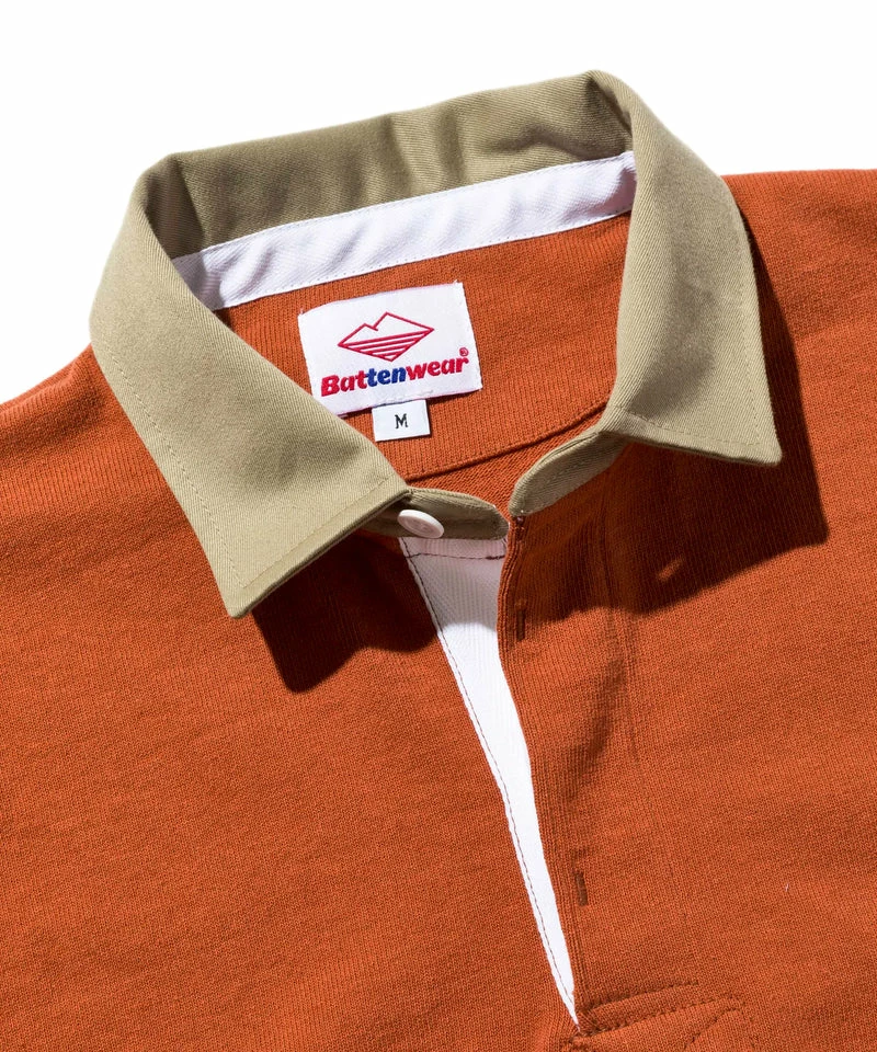 The tried and tested tough 12oz jersey Battenwear rugby shirt in a new rust colorway. Left chest pocket, tan twill collar with a conceal button placket. Battenwear logo patch on pocket.