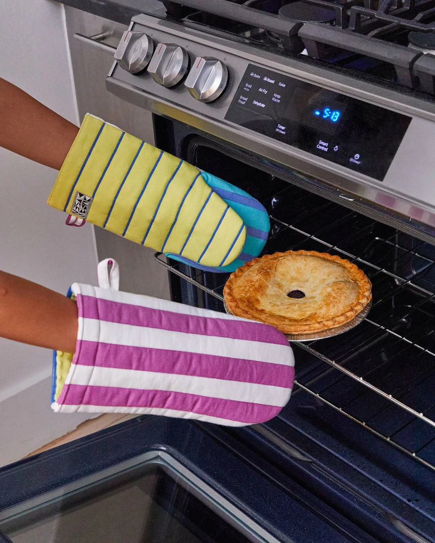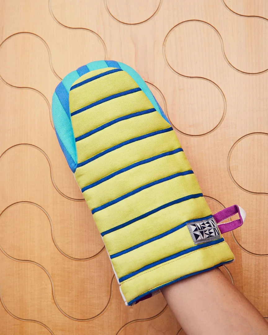A cotton padded oven mitt with 3 different panels of variable striped patterns. Can withstand temperatures up to 400 degrees F