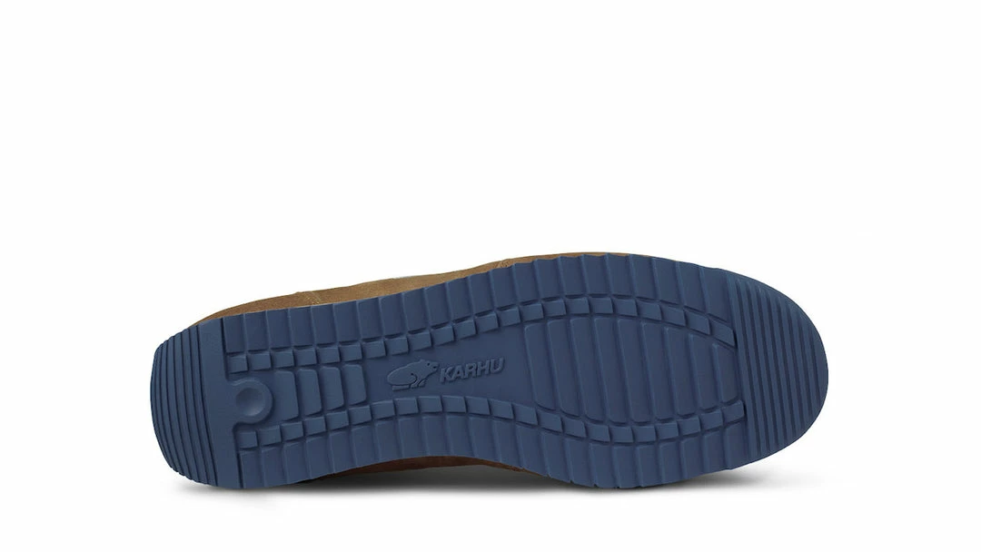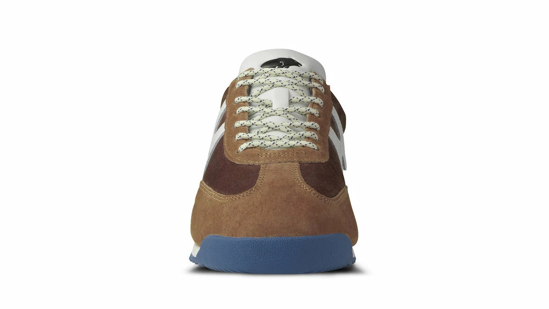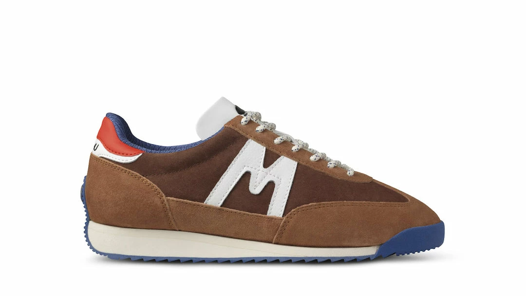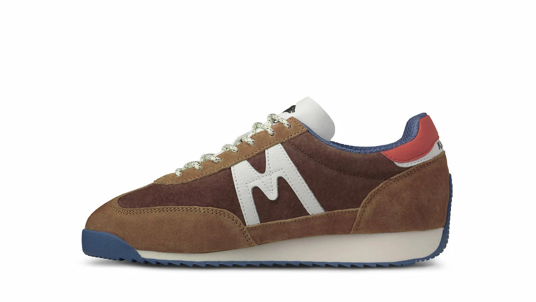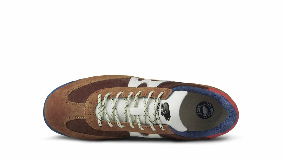 The Karhu Mestari model with its hidden air cushion in the heel, suede and leather upper, and rope style laces