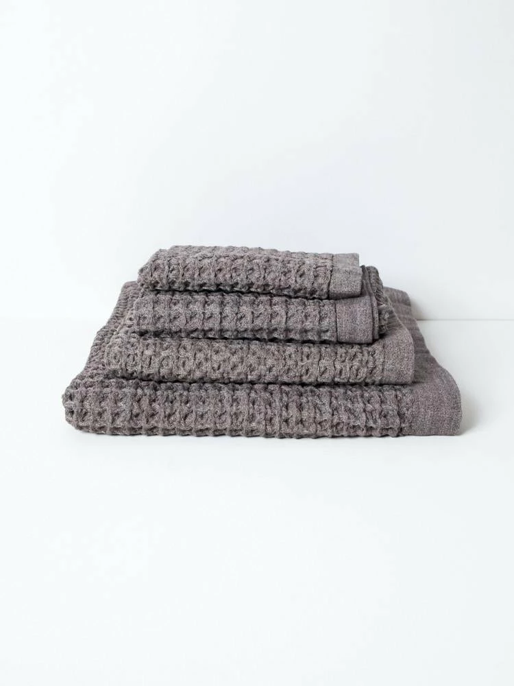A waffle weave cotton towel, quick drying, and remarkably absorbant, in a neutral brown-grey