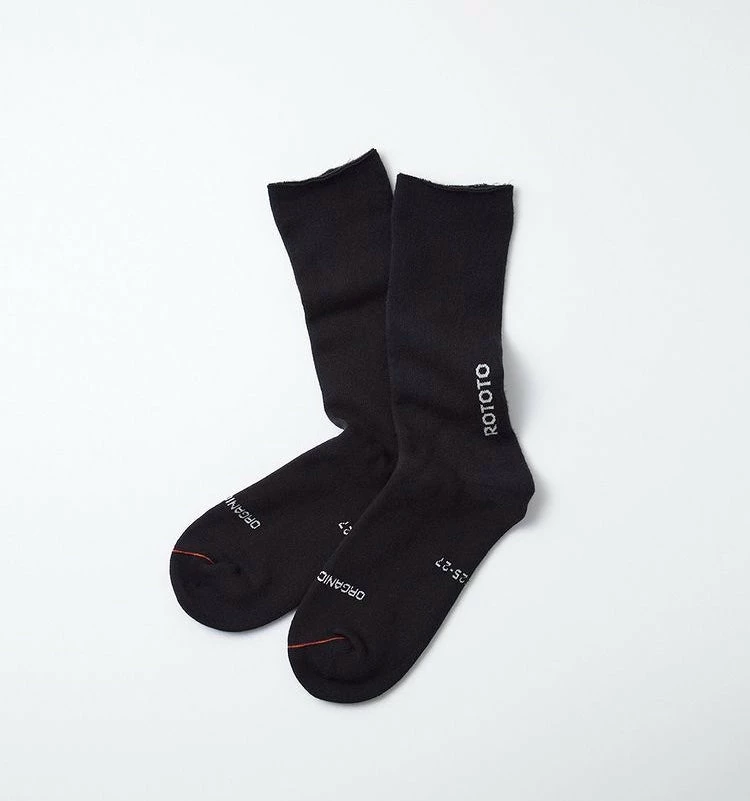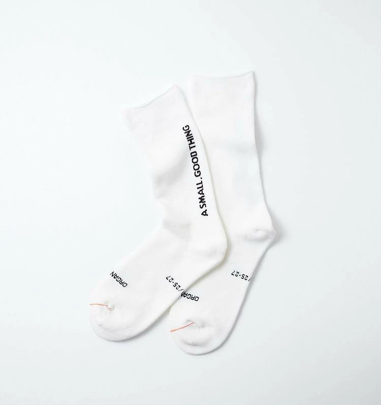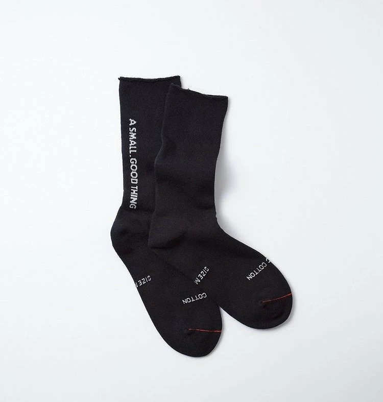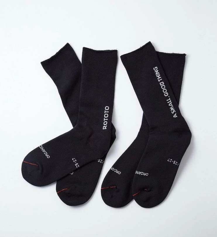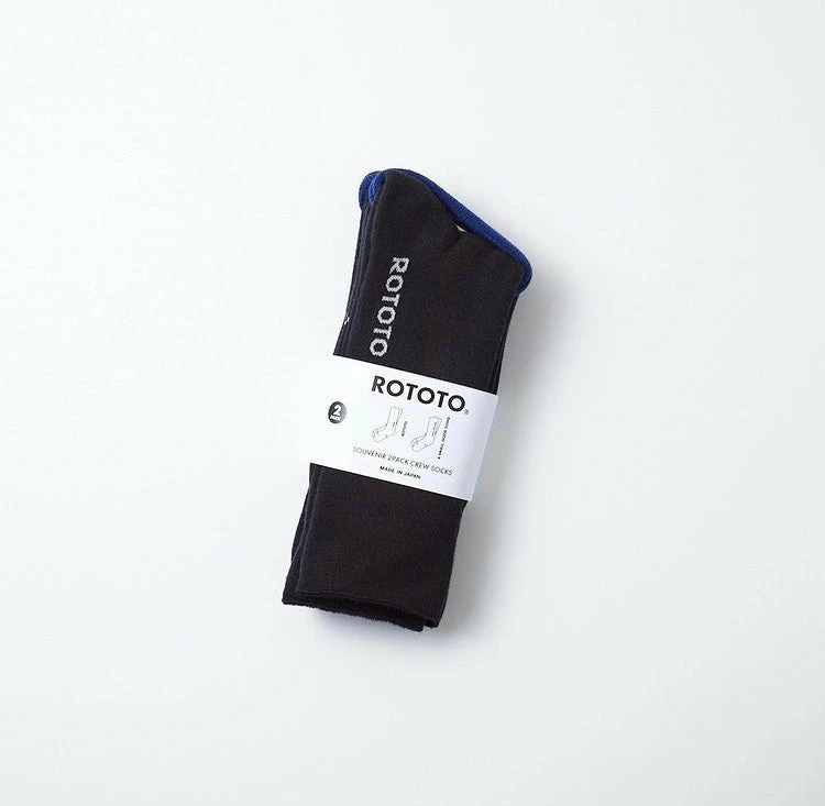 Two pairs of socks, each with a different design, in one set. One is adorned with a “ROTOTO” logo, the other says “A SMALL, GOOD THING”