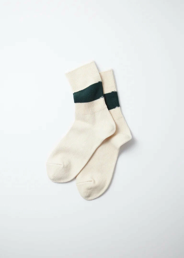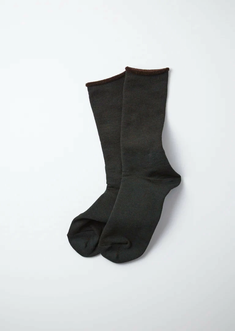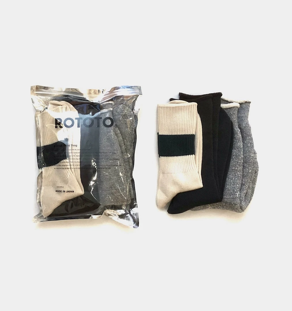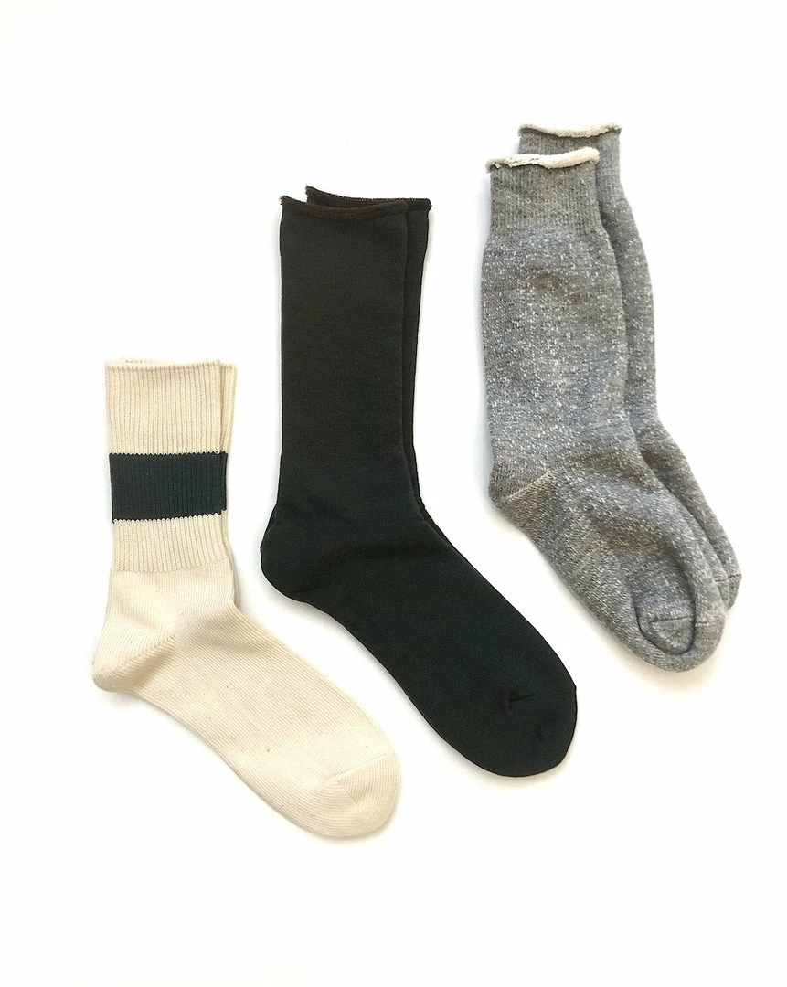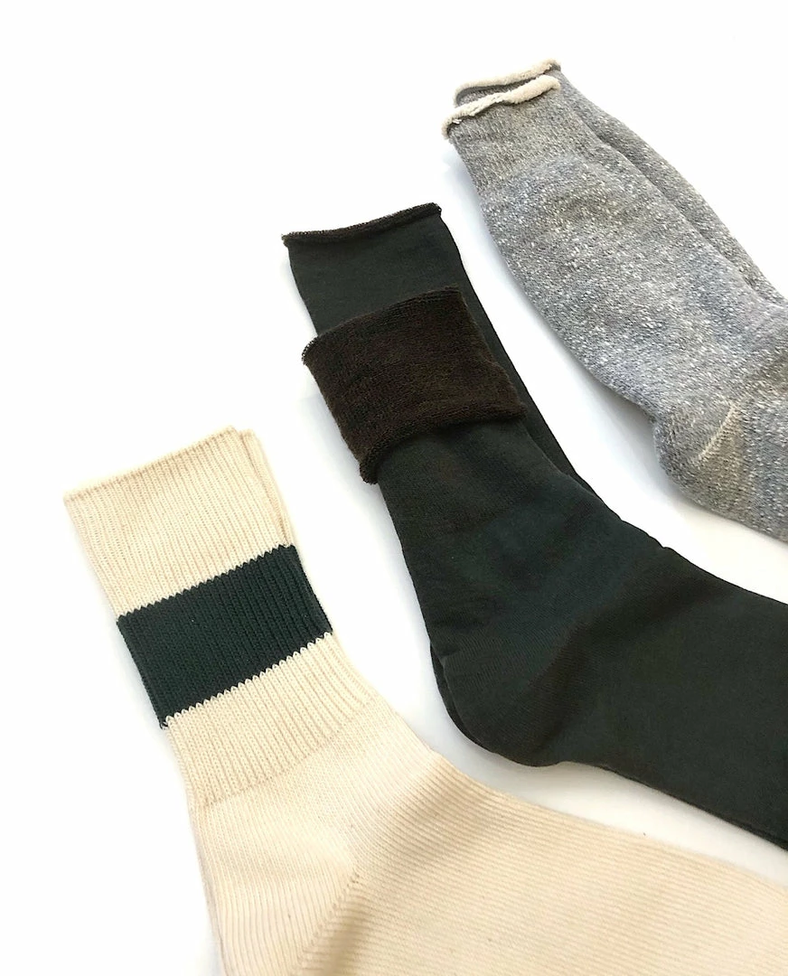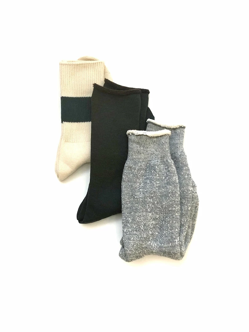 A special assorted trio of 3 Rototo styles. In this pack you gat a classic cotton rib crew sock in a natural organic cotton, with a dark green stripe. A wool “City Sock” in a dark green which has a comfortable pile interior throughout the entire sock in a contrast brown, and the classic bulky double-face sock in a classic grey cotton & wool blend.