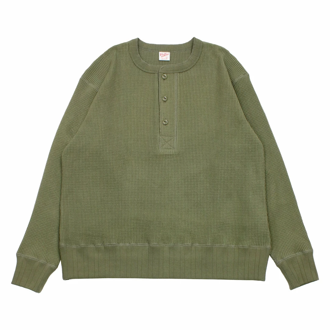 A soft waffle thermal henley shirt with a variable width ribbed collar, cuffs, and bottom hem line