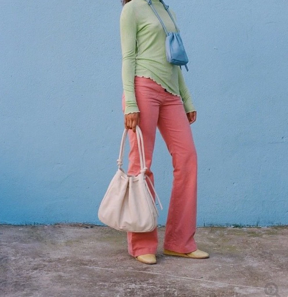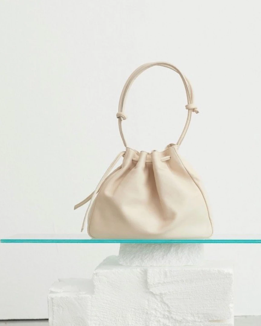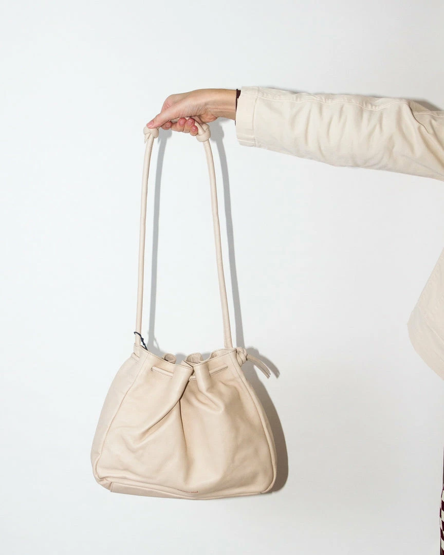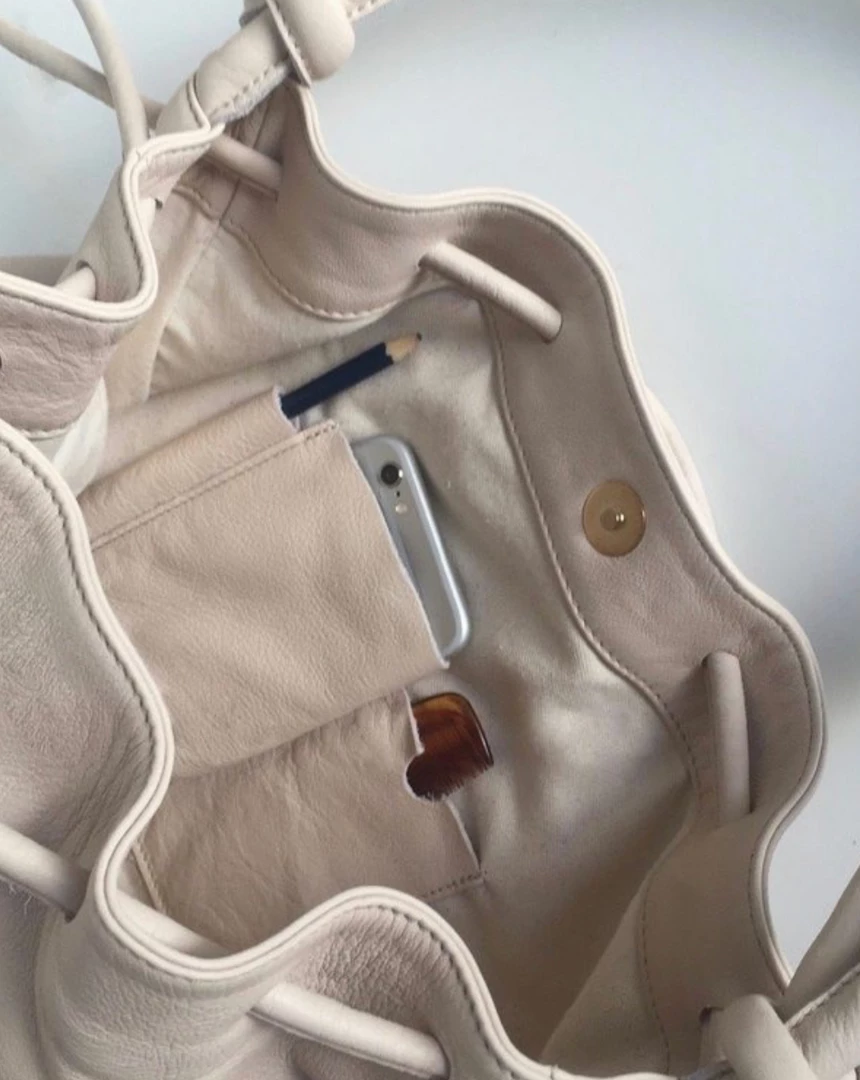 A beautiful leather purse with an adjustable strap that cinches the bag closed, interior zip pocket and organizer slots, magnetic snap button closure