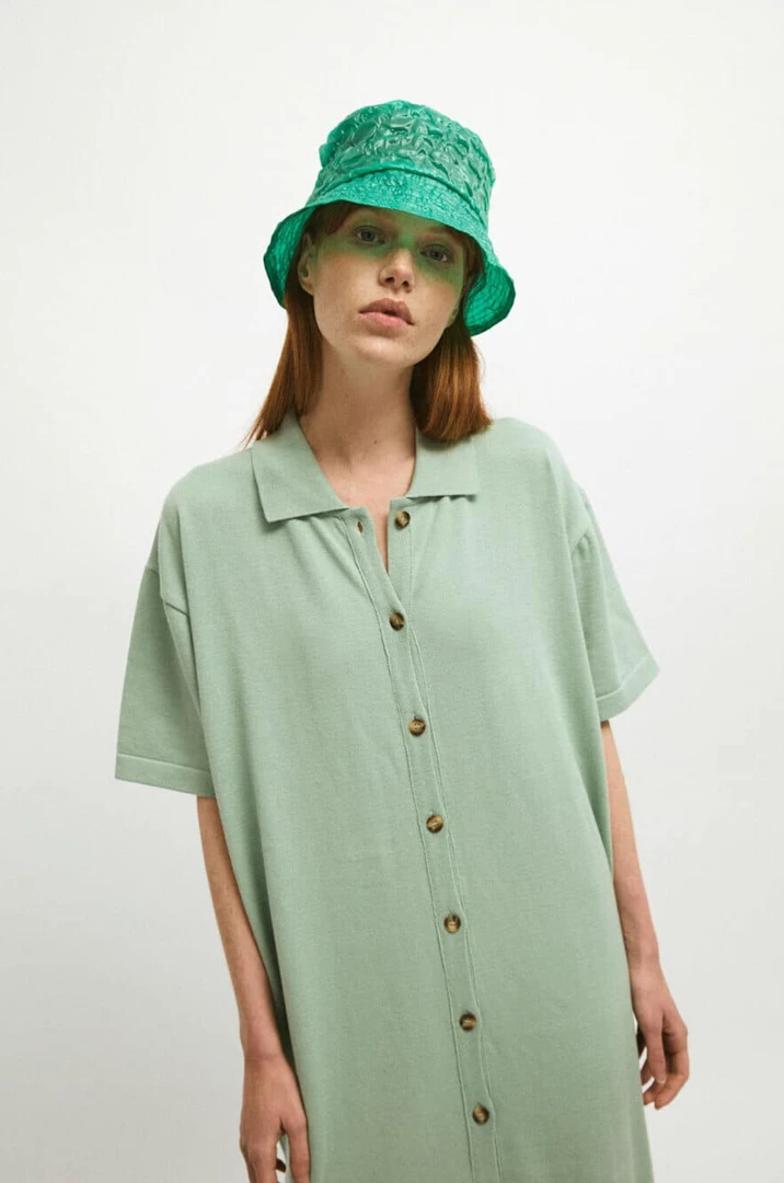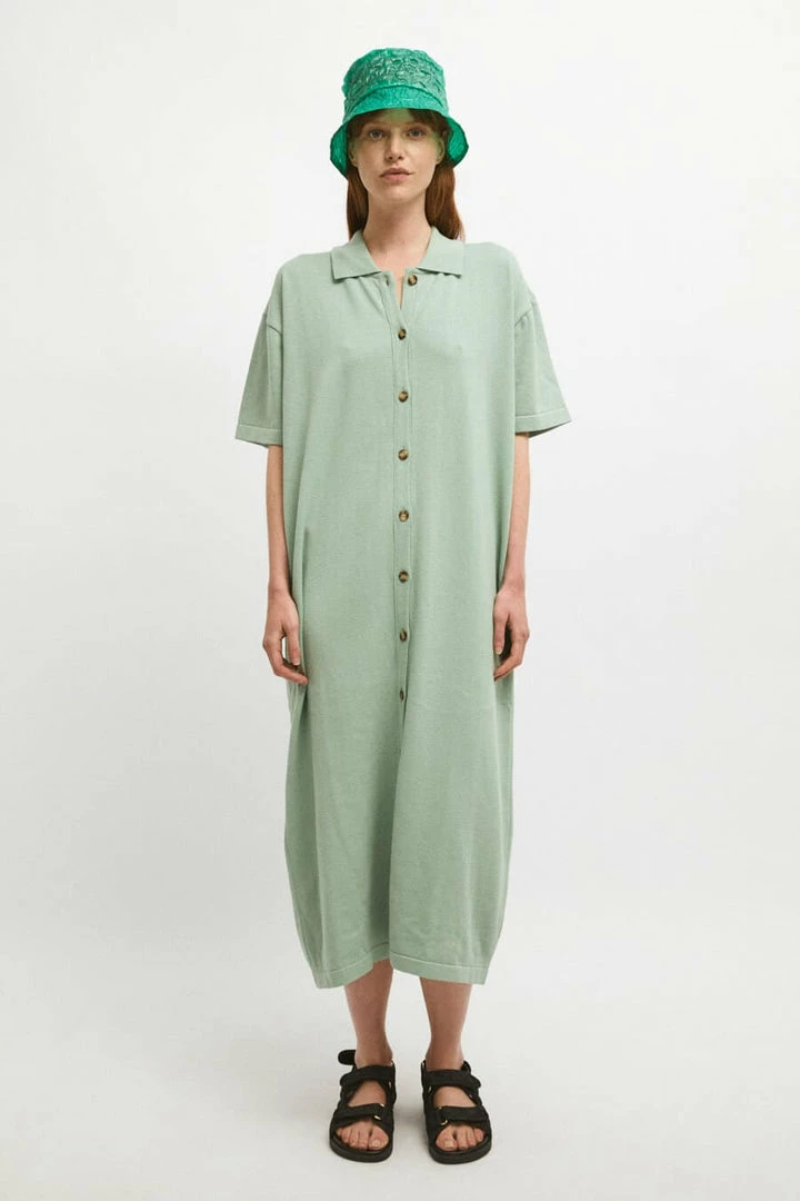 A soft knit long cotton dress with a full button front, slight drop shoulder