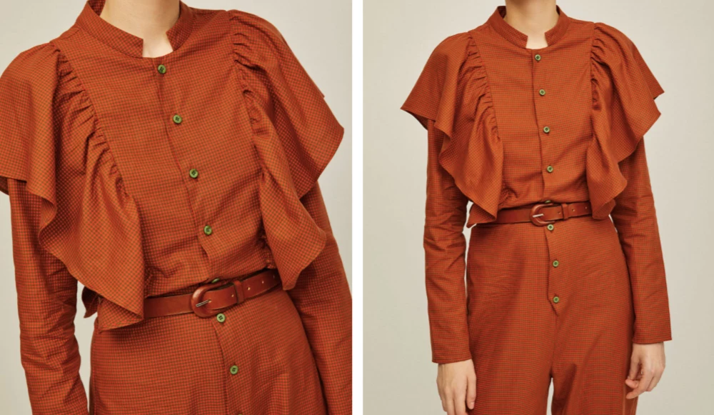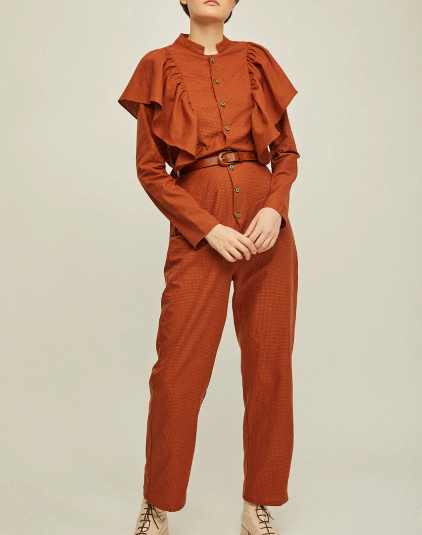 Stylish and comfortable jumpsuit with flounces. Easy to wear belted or standalone.
