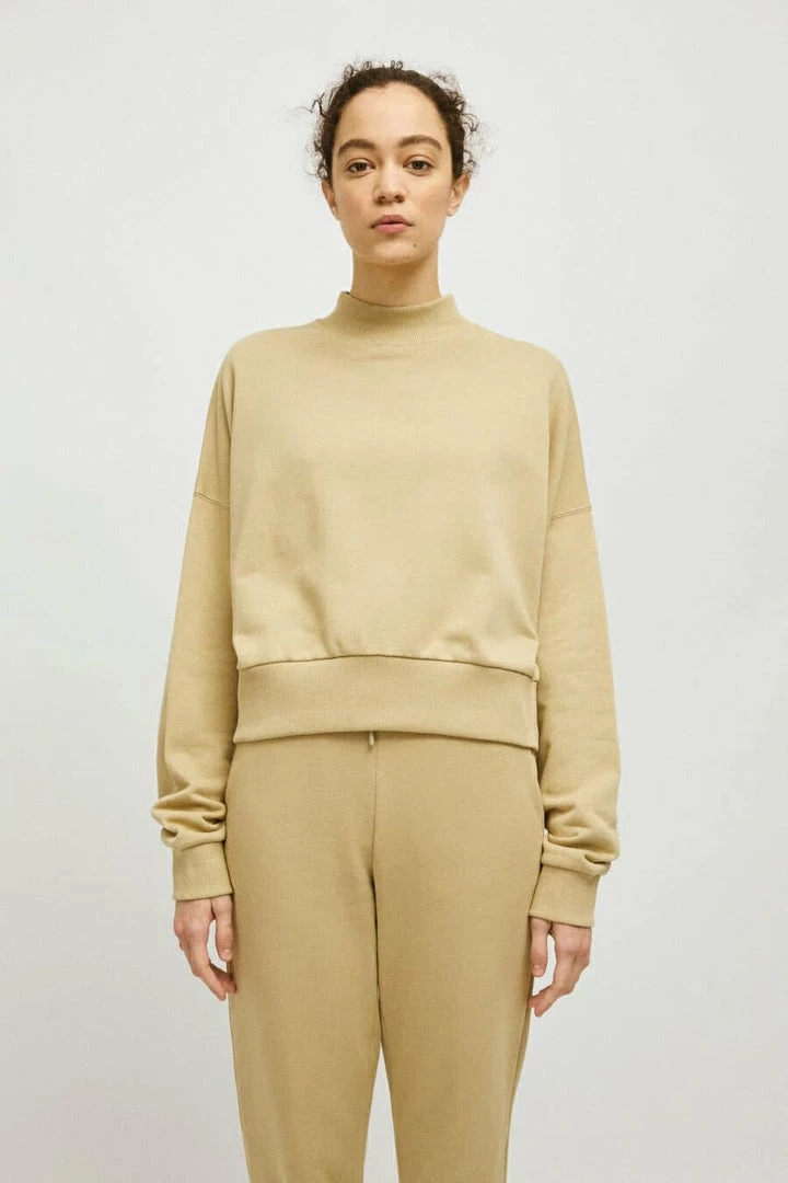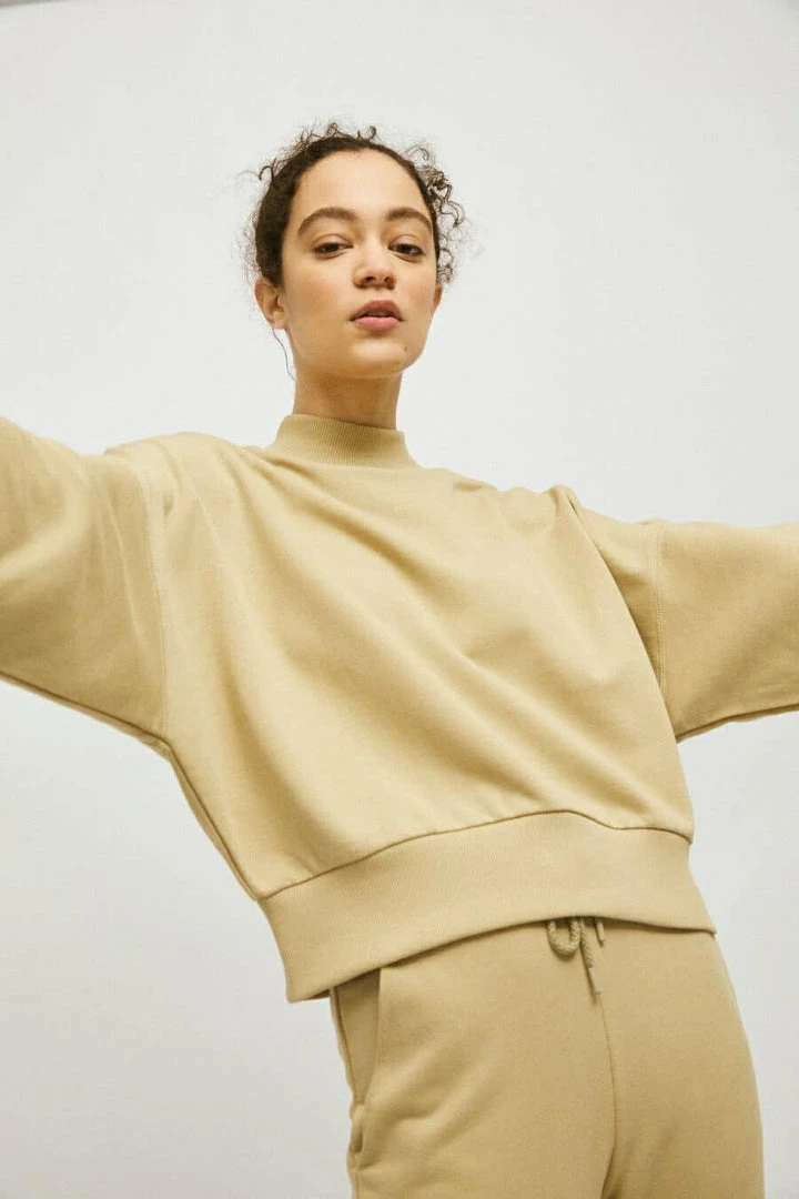 A relaxed fit drop shoulder funnel neck sweatshirt with neck, cuff, and bottom hem rib cotton finishing