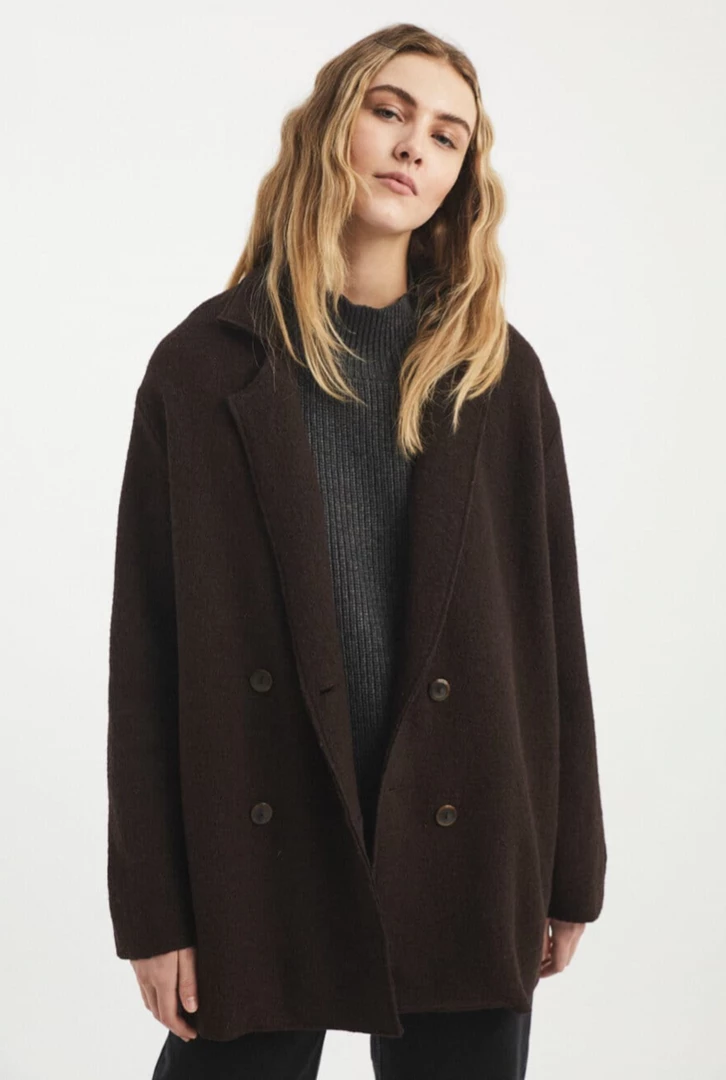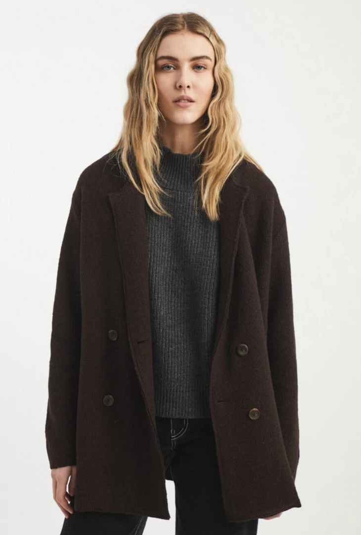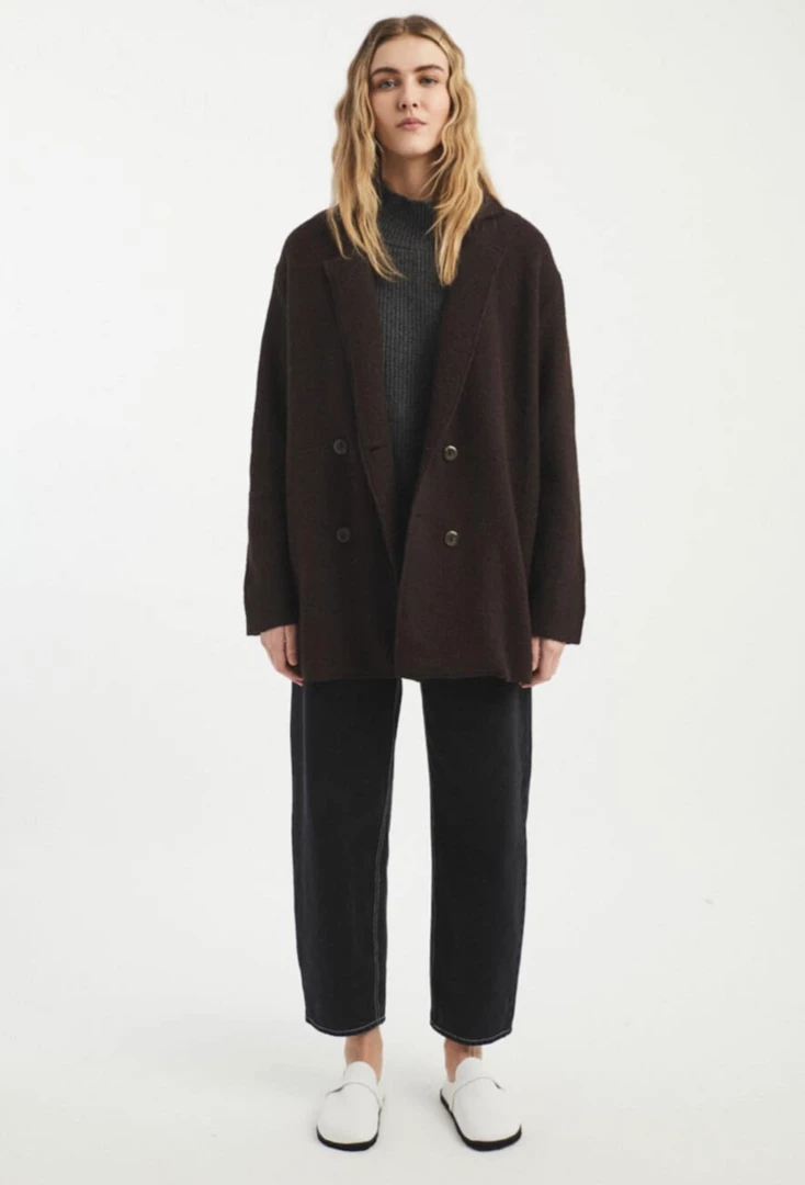 A straight relaxed fit wool blazer in a rich dark chocolate brown, and a soft bouncy boucle-like texture